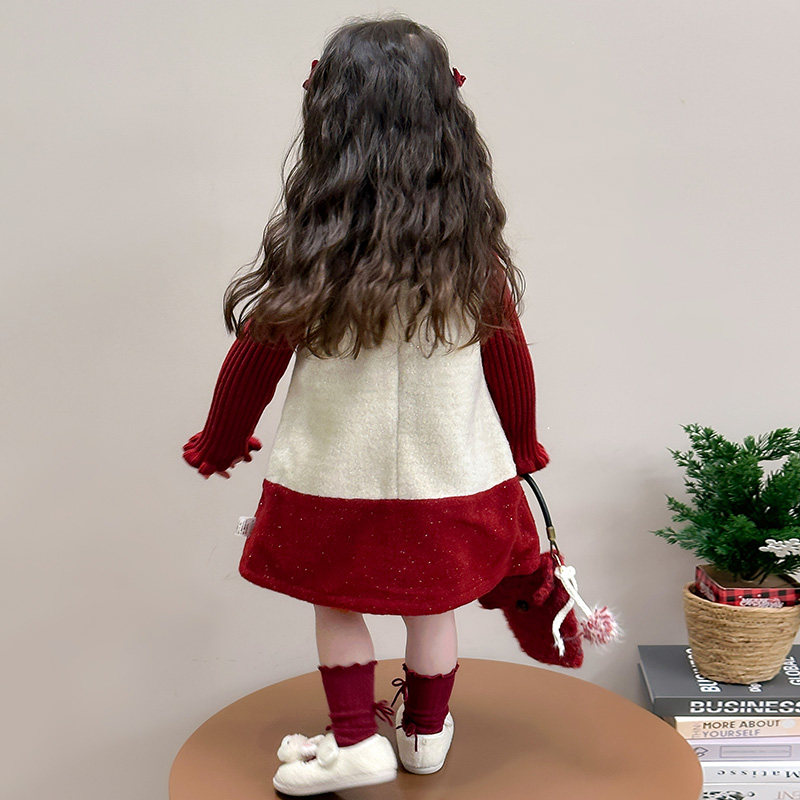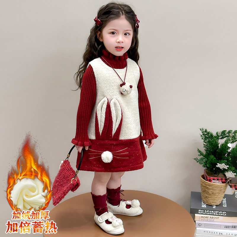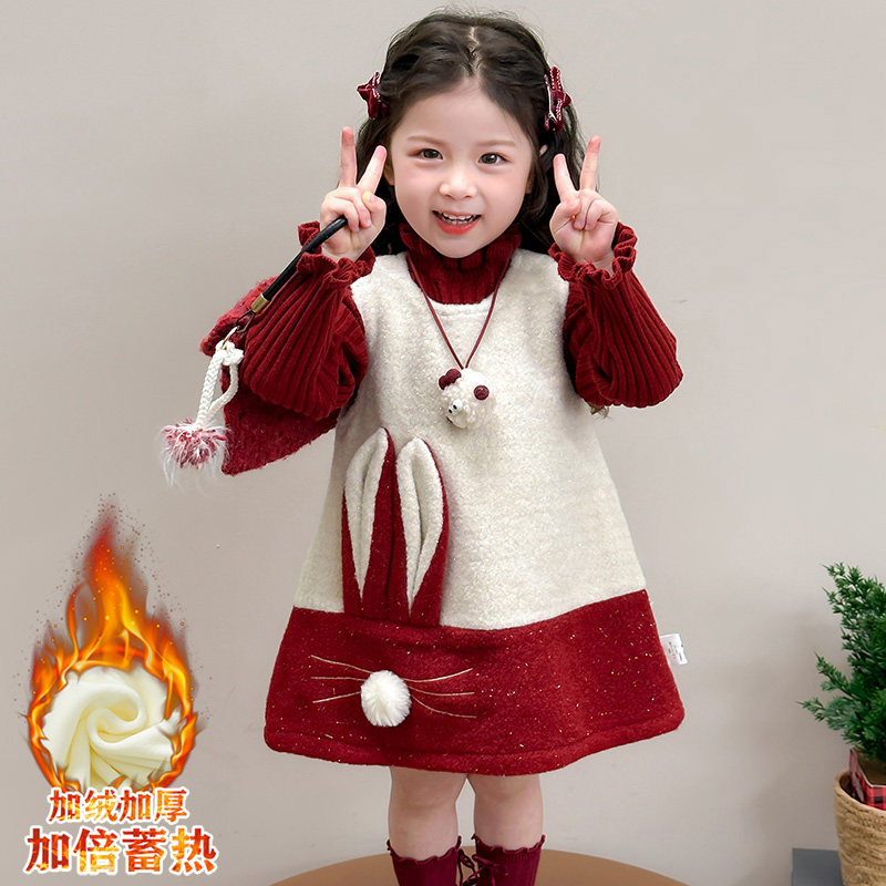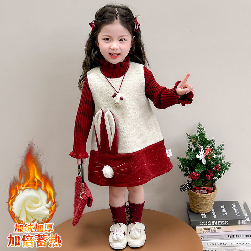 女童冬季连衣裙套装女宝宝秋冬装新款绣兔子年服儿童公主裙两件套