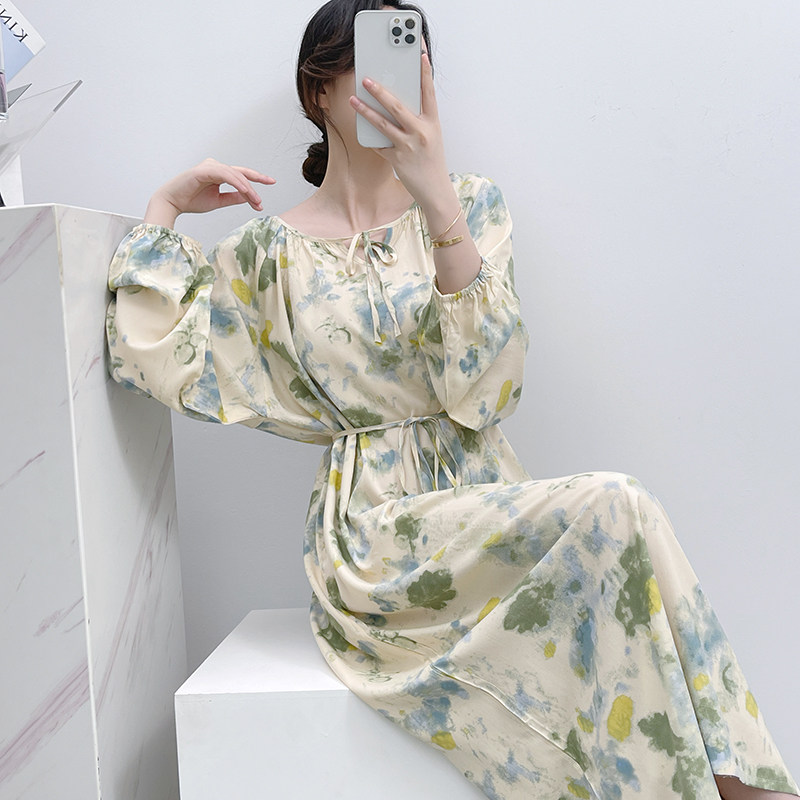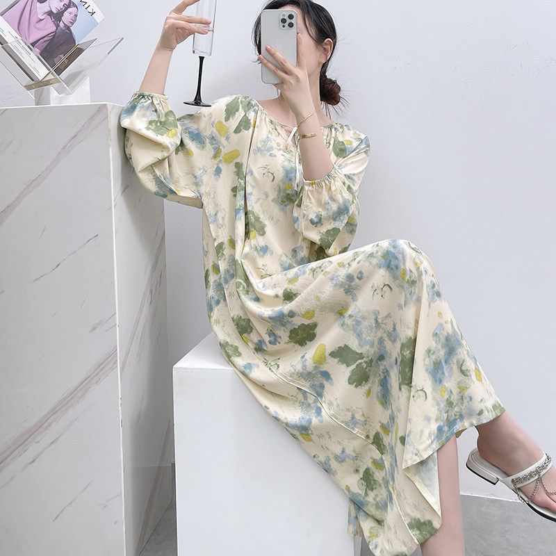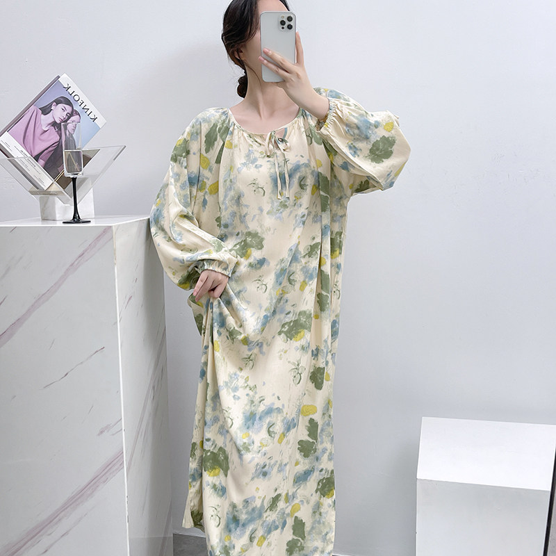 春夏季棉绸睡裙女士绵绸家居服睡衣夏天长袖长裙胖MM可外穿连衣裙