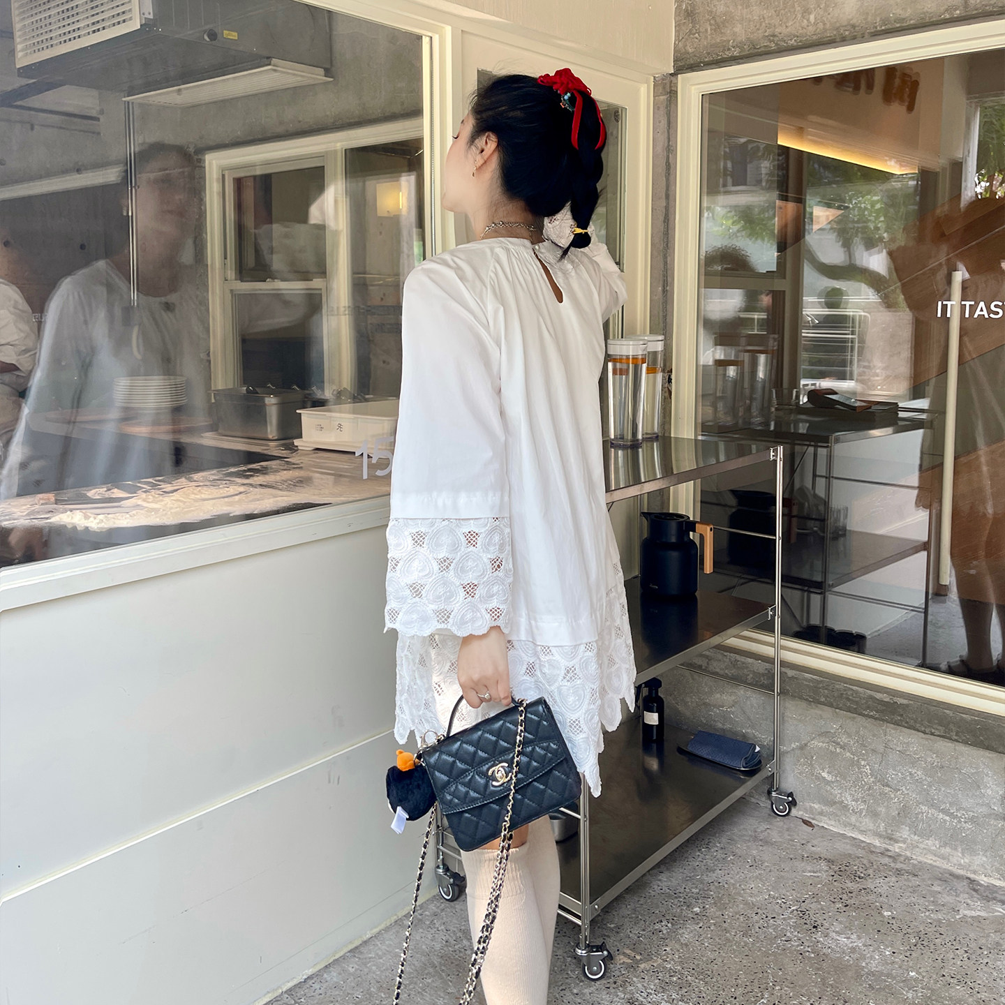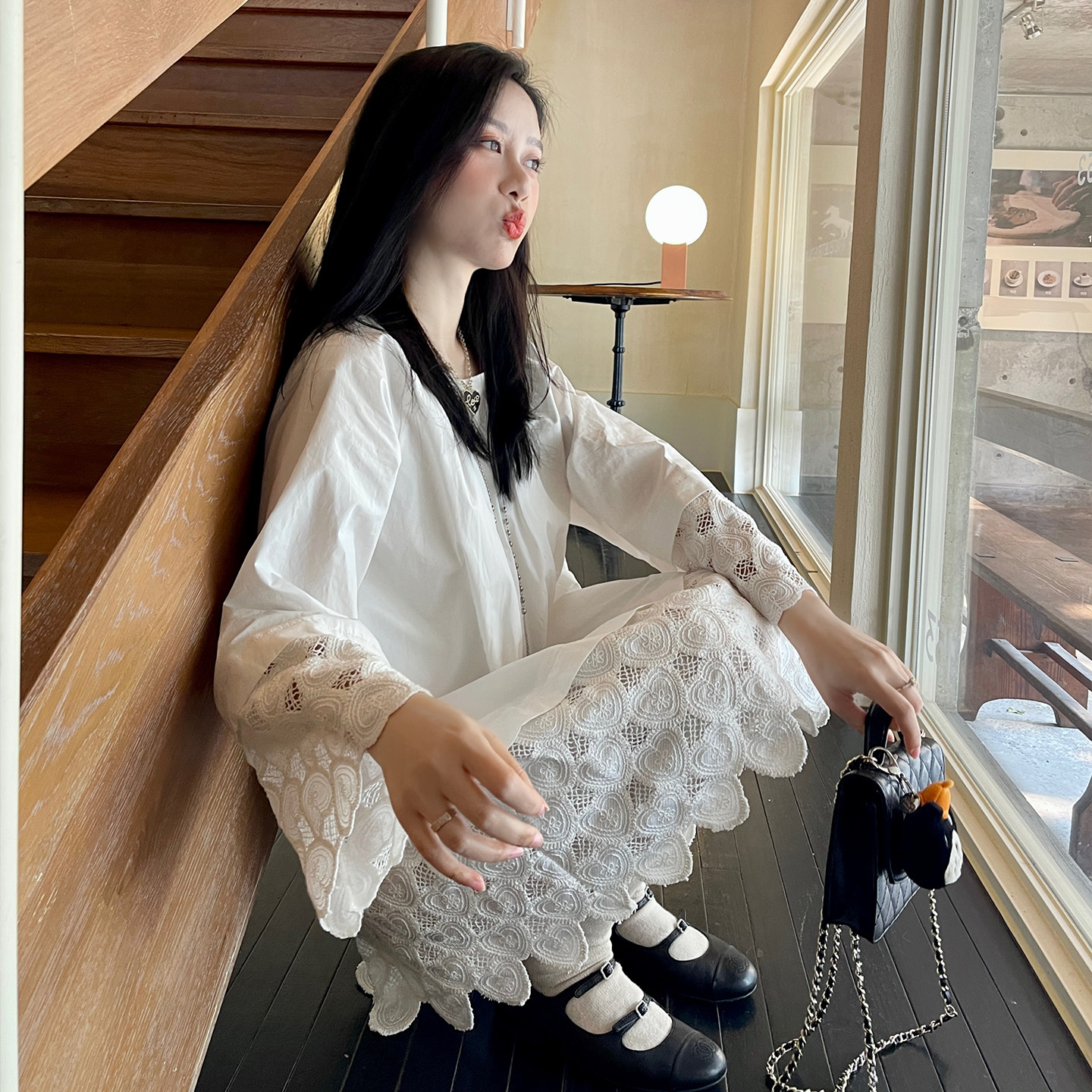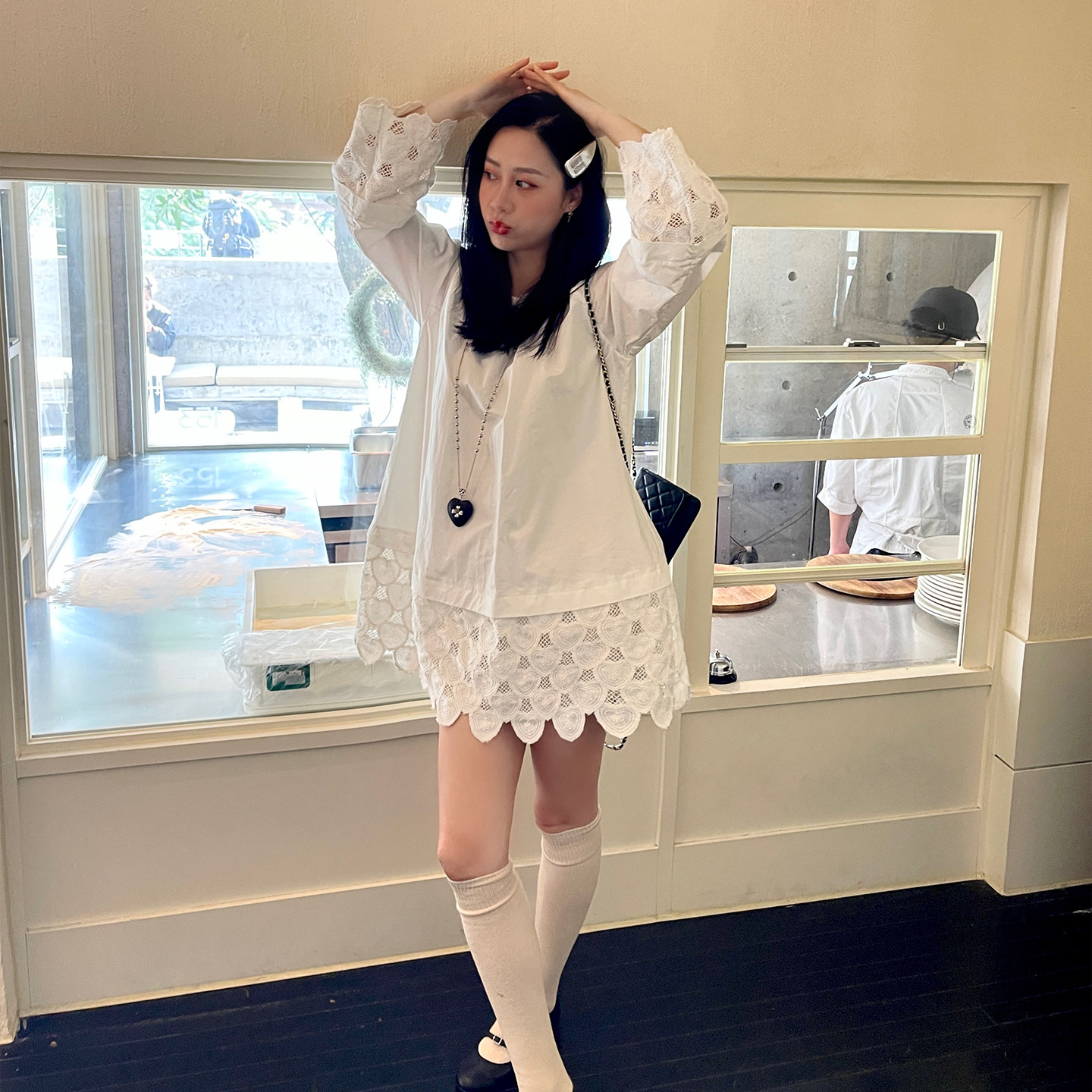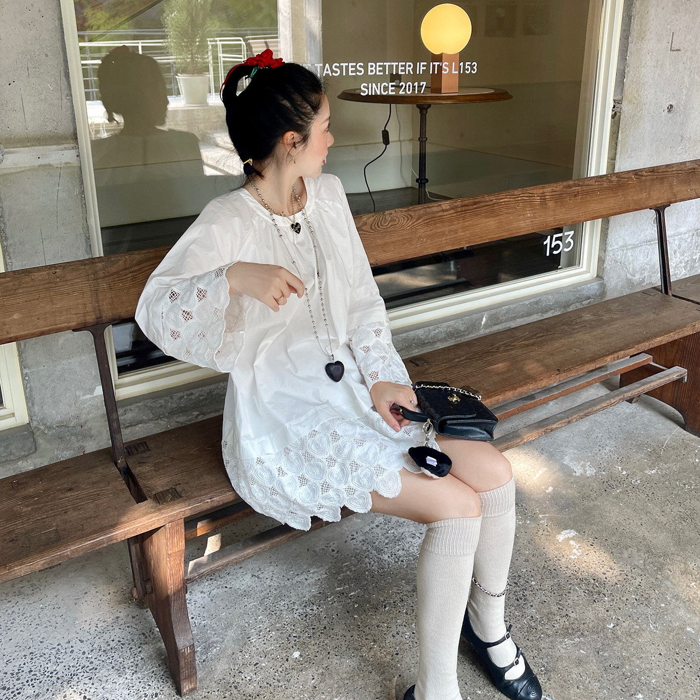 heidy海蒂 爱心攻击 白色刺绣拼接荃棉长袖连衣裙宽松娃娃短裙春