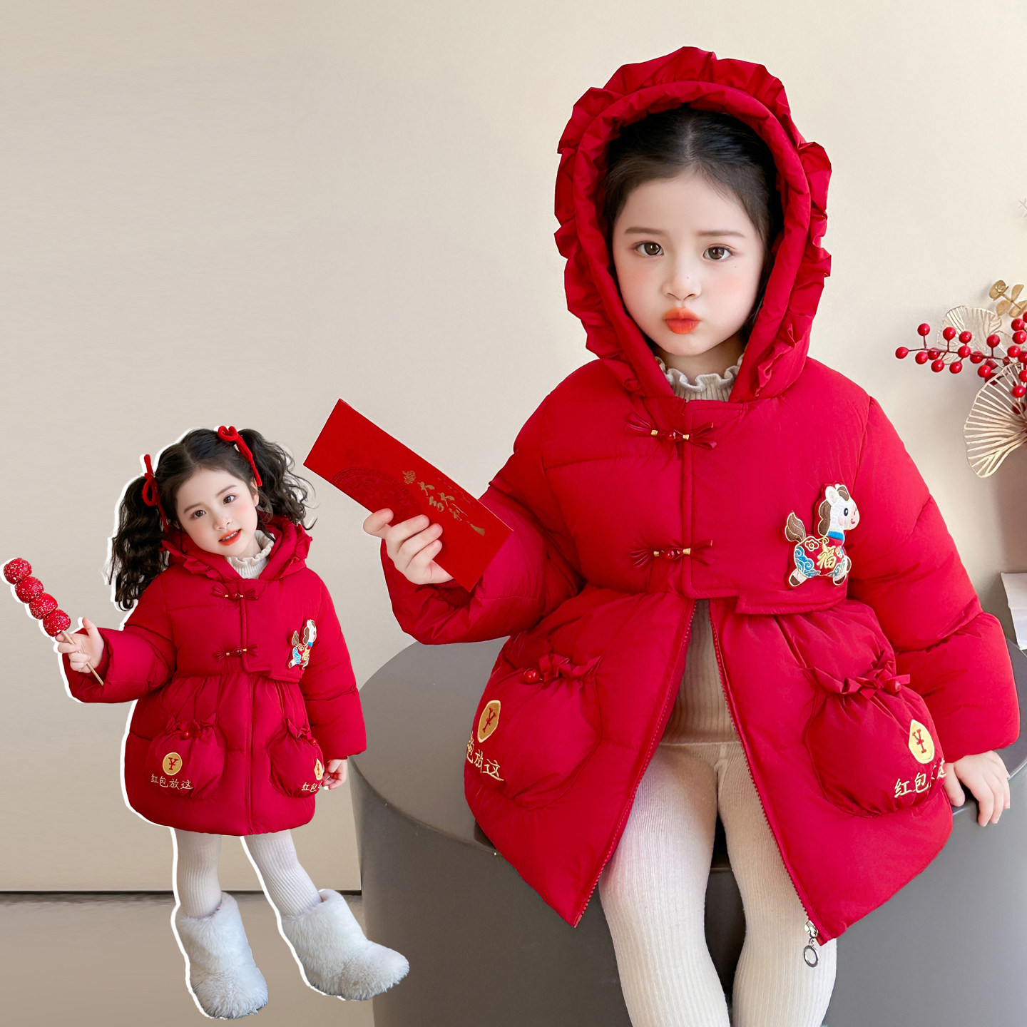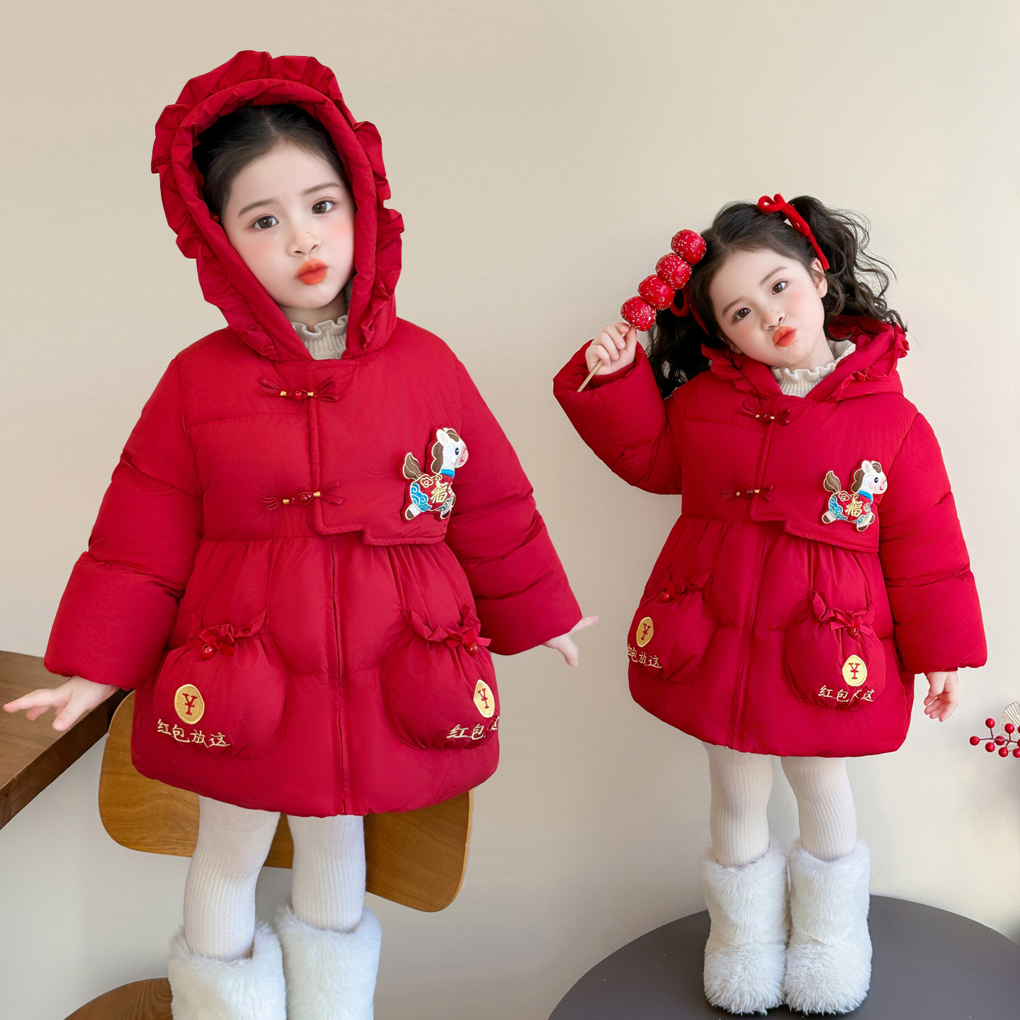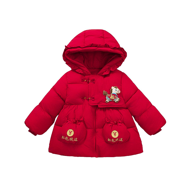女童红色外套冬装新款加绒加厚中长款棉袄女宝宝拜年服冬天时尚潮