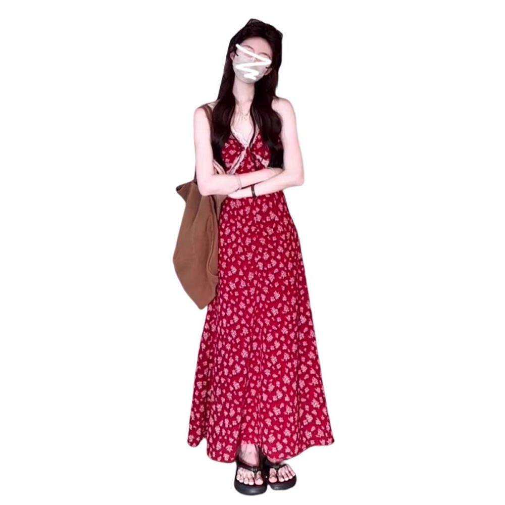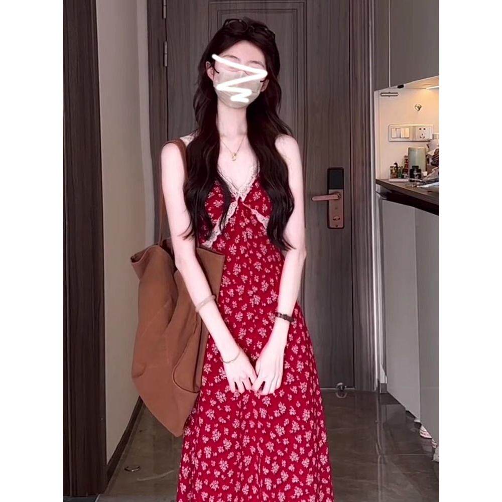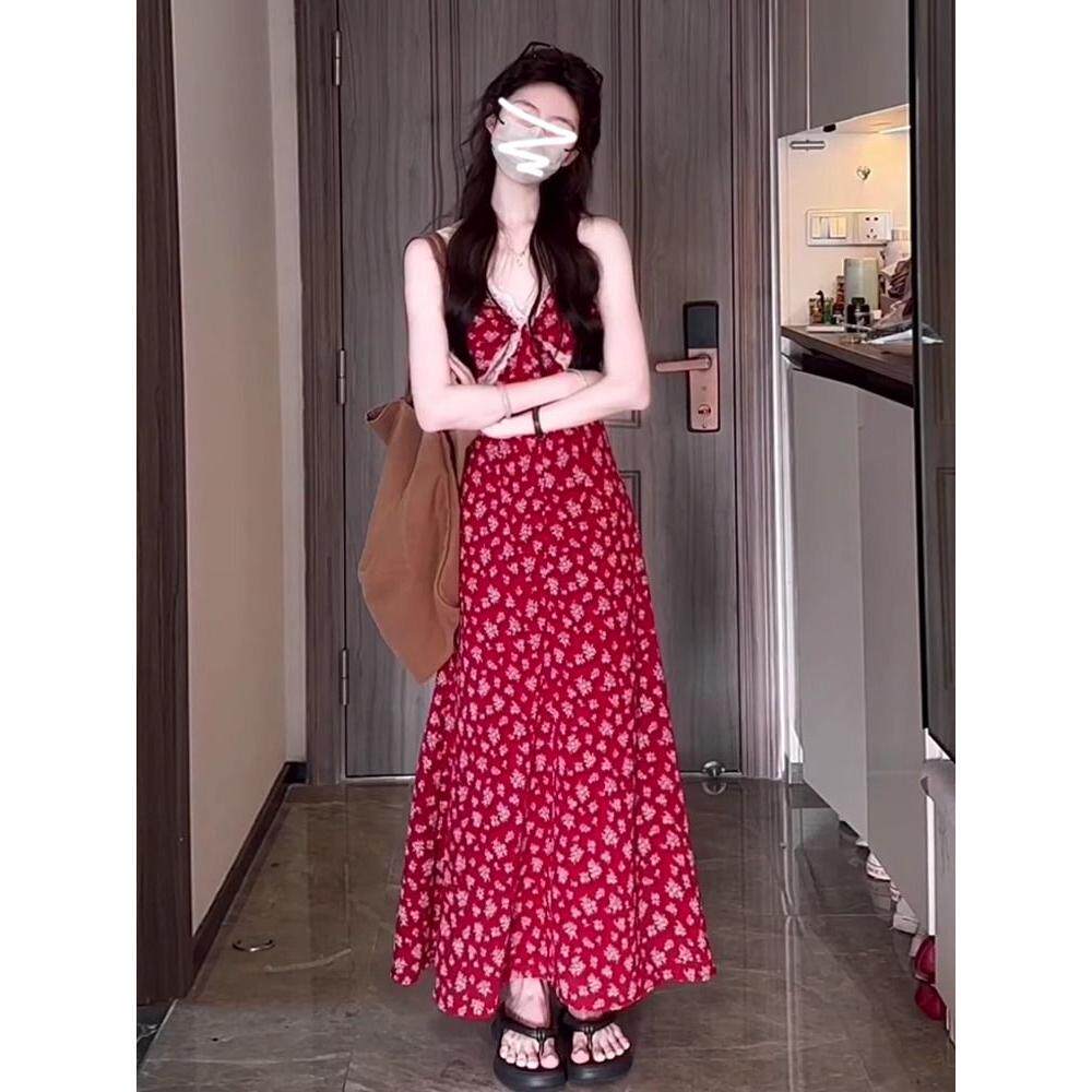海边度假红色碎花吊带连衣裙子女夏季2026新款小个子气质长裙
