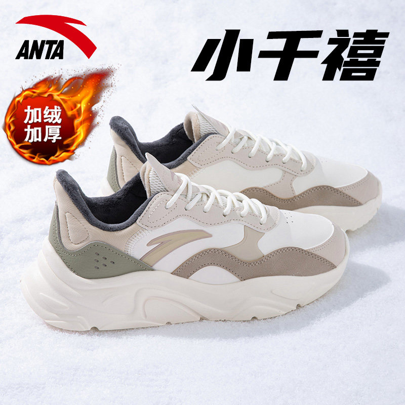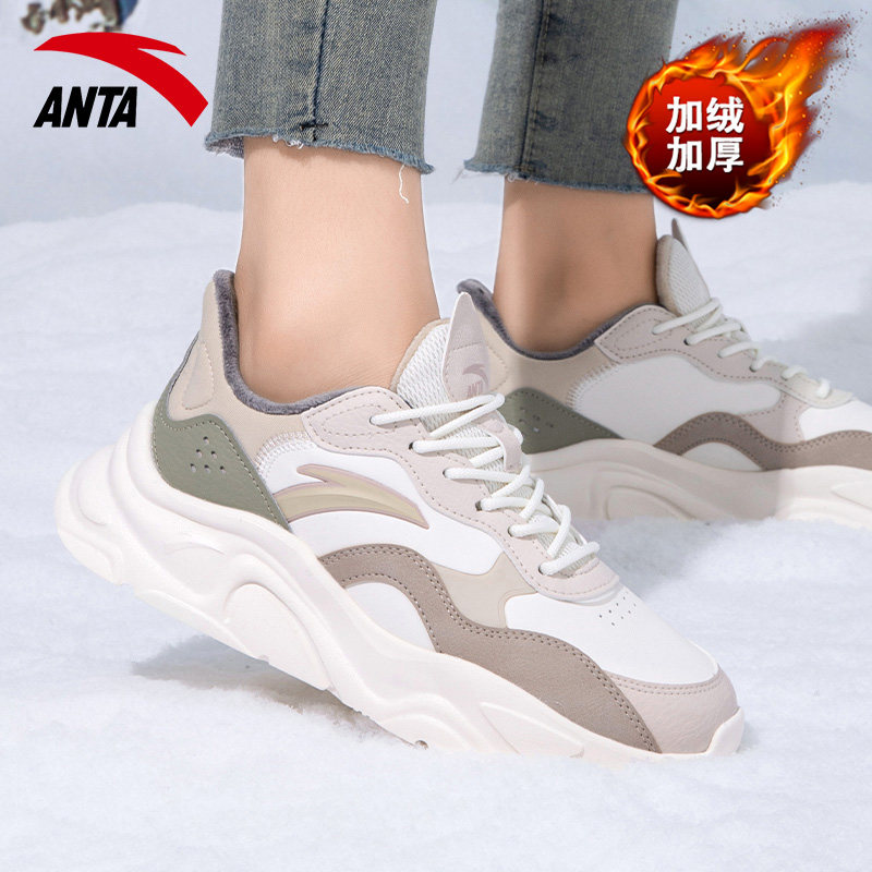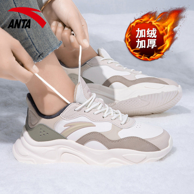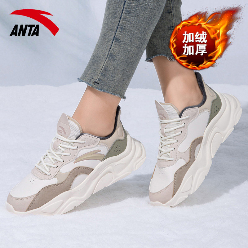 安踏女鞋冬季加绒保暖棉鞋皮面休闲运动鞋厚底增高复古老爹鞋女款