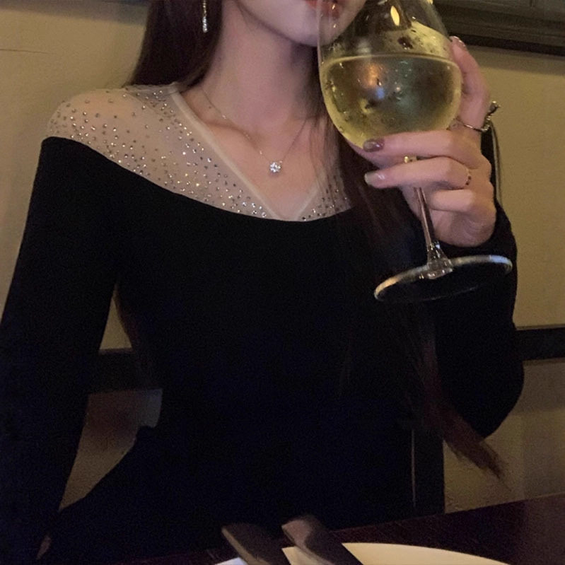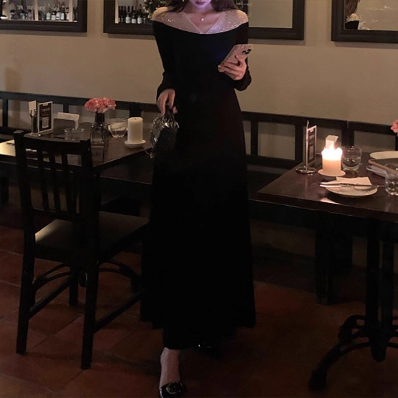 【星河】法式拼接连衣裙女秋冬长袖收腰气质优雅黑色长裙