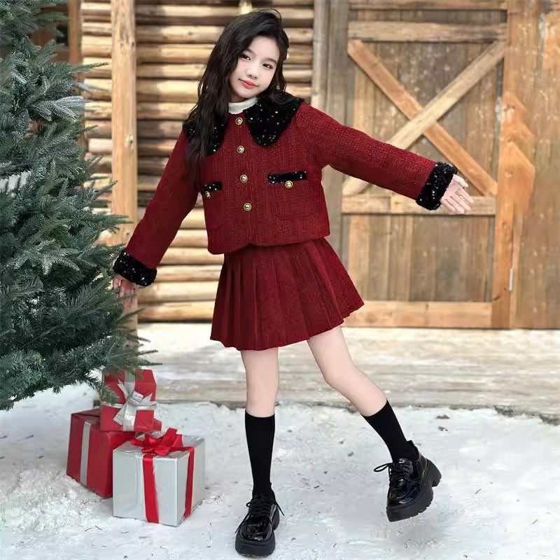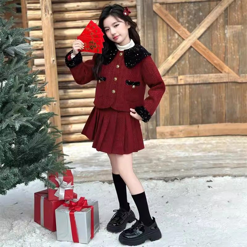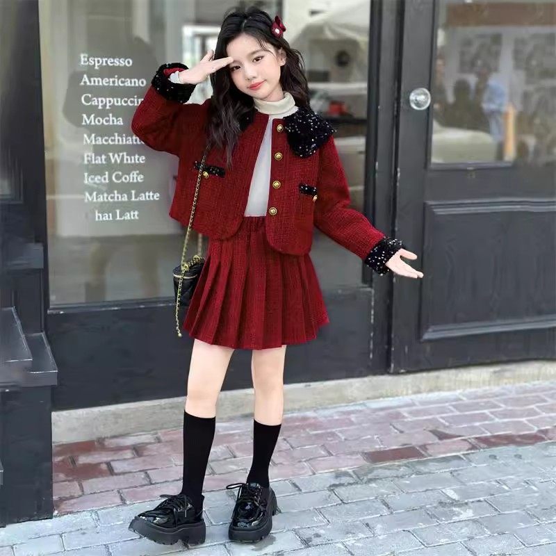 QKIKT女童连衣裙喜庆拜年服秋冬2026新款儿童小香风套装新年衣服