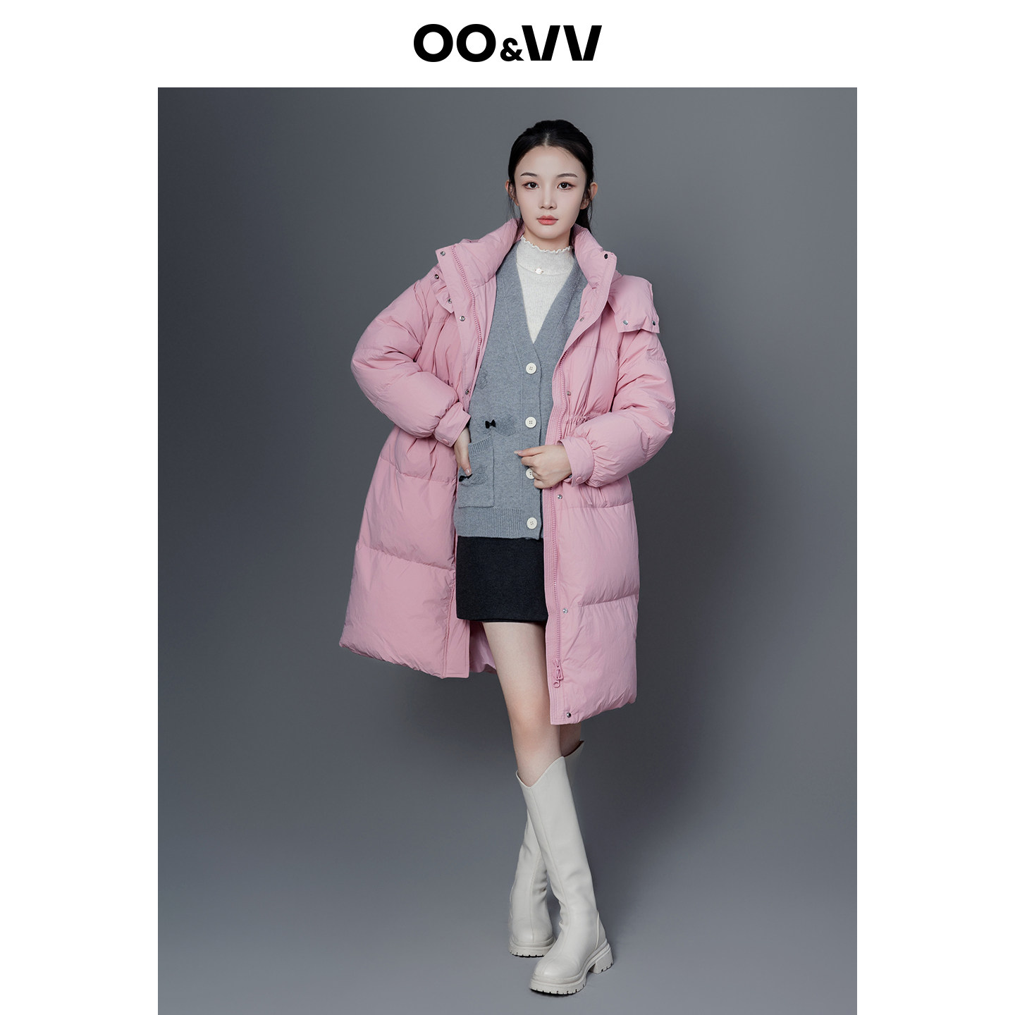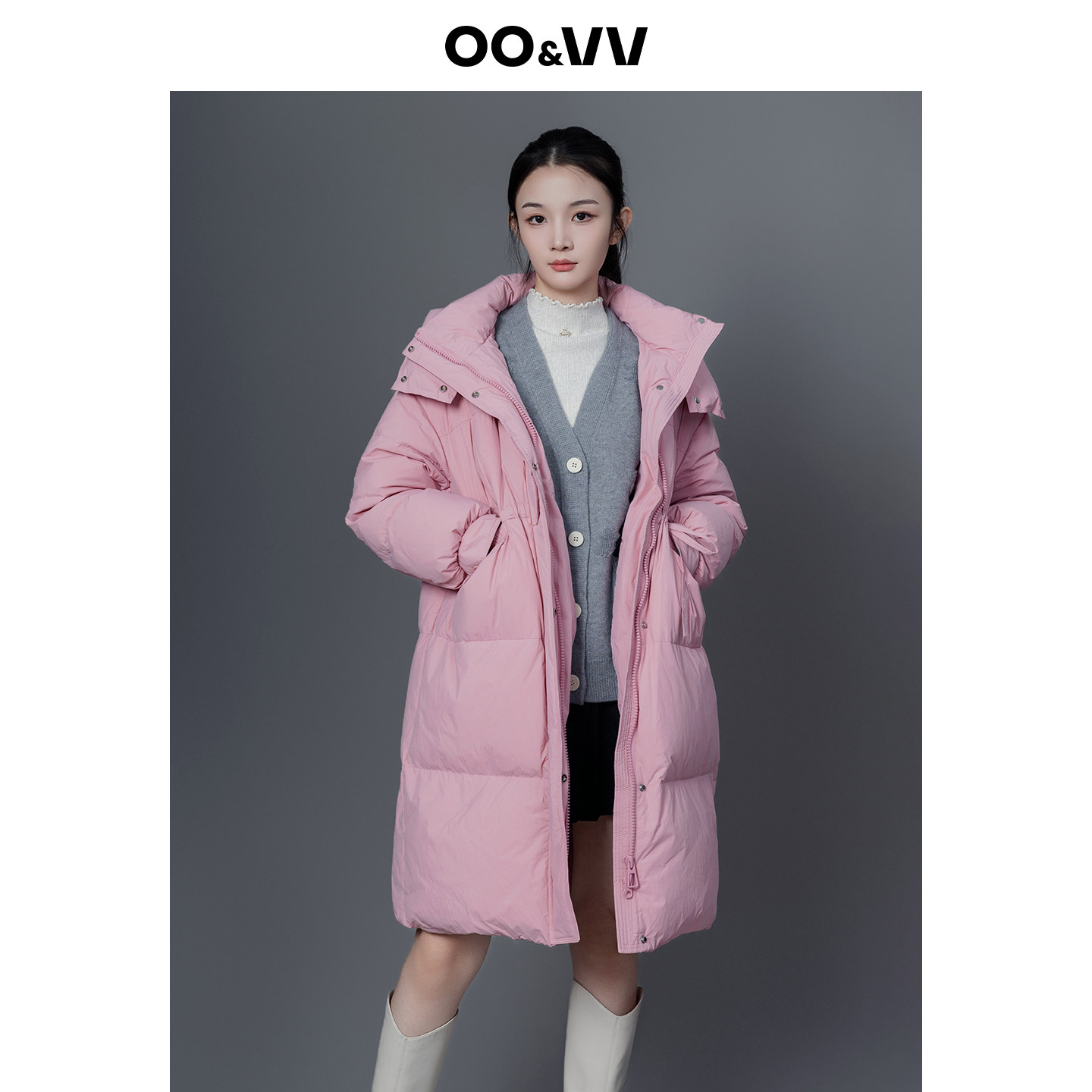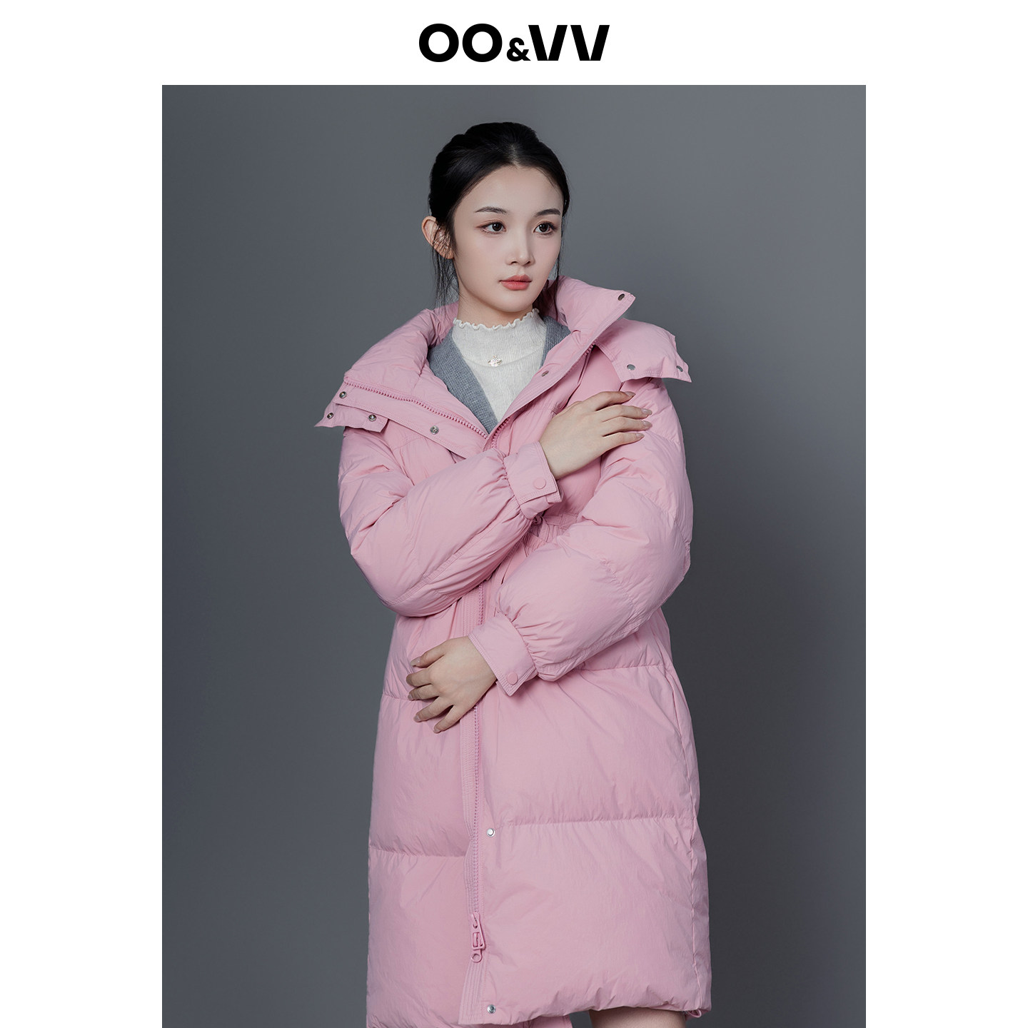 oo&vv甜美粉色连帽立领羽绒服25冬装新款甜美显瘦长外套保暖加厚