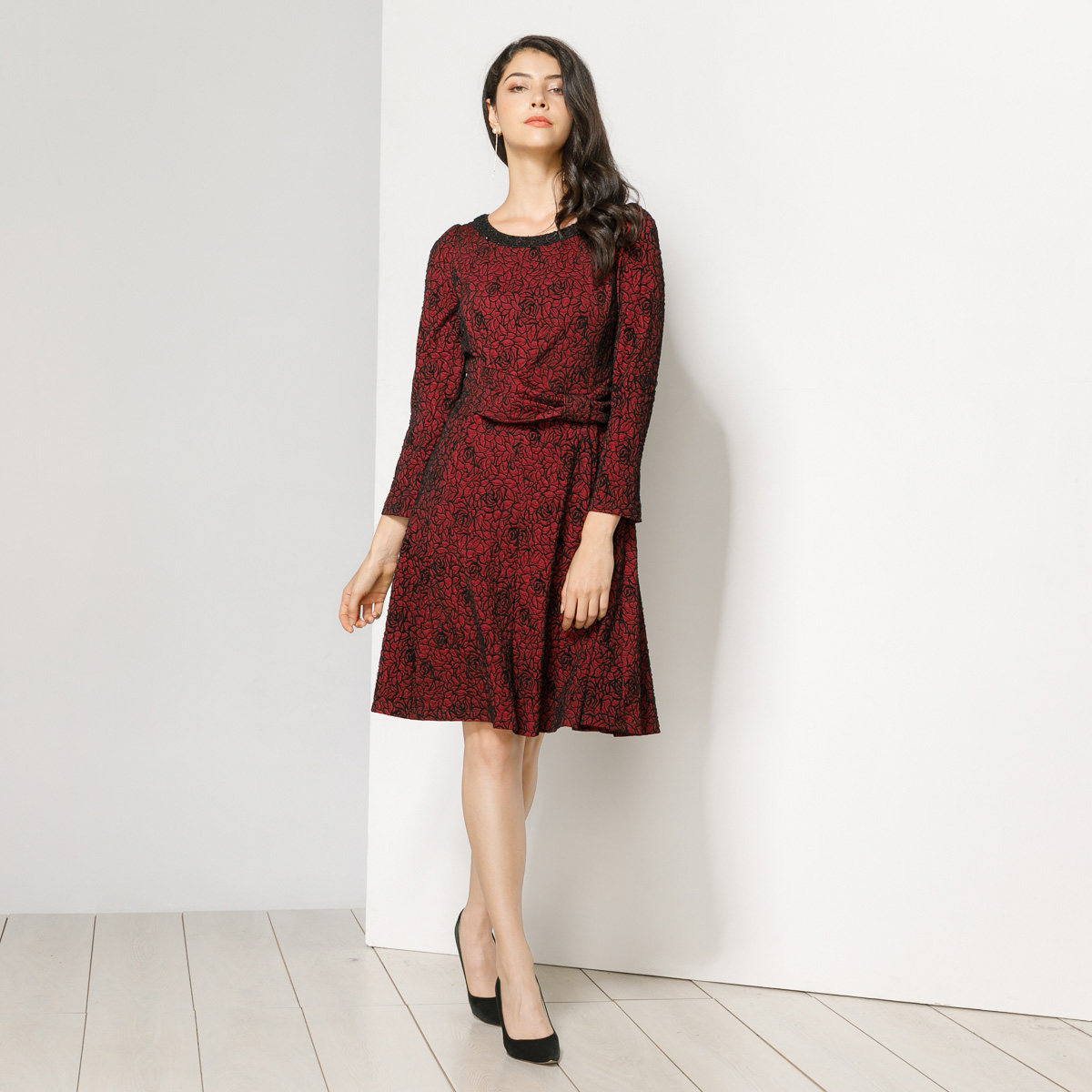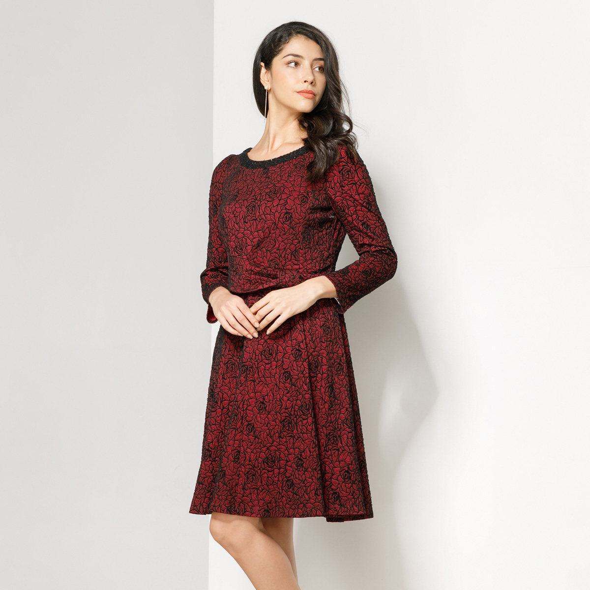 玫而美连衣裙长袖圆领中长款中年蕾丝绣花收腰显瘦女士秋冬a字裙