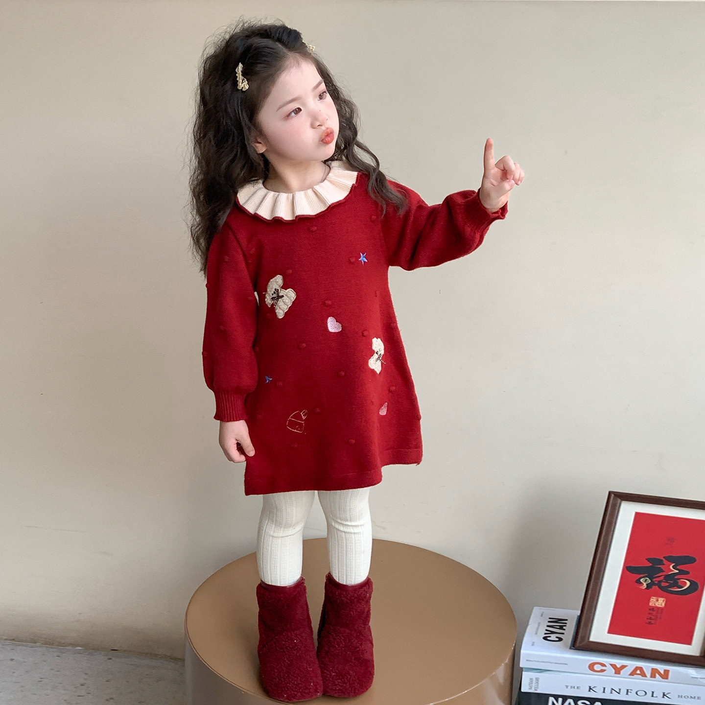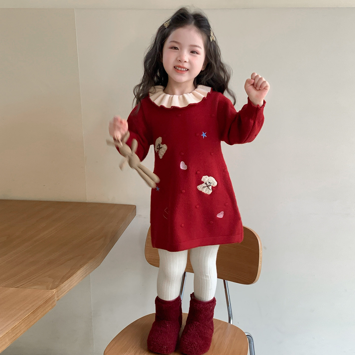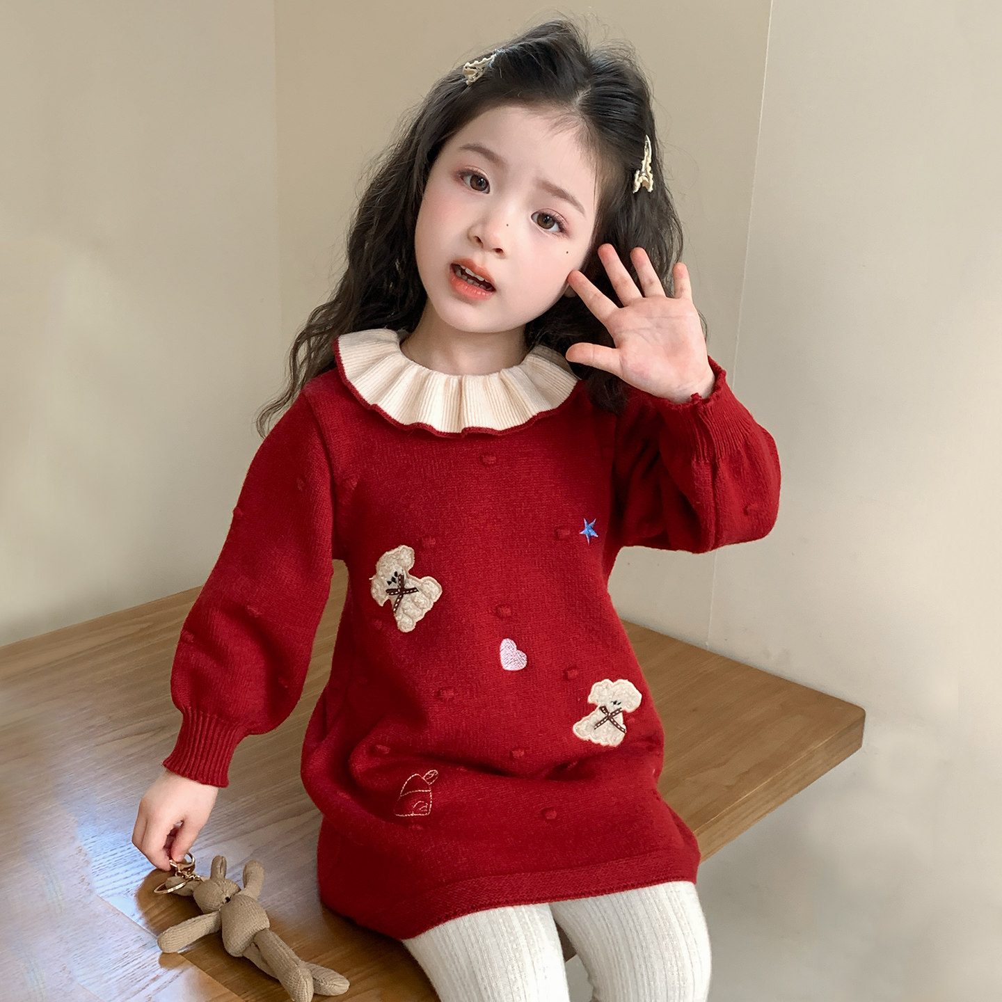 女童过年服连衣裙2026新款红色儿童拜年服冬装小熊女宝宝毛衣裙子