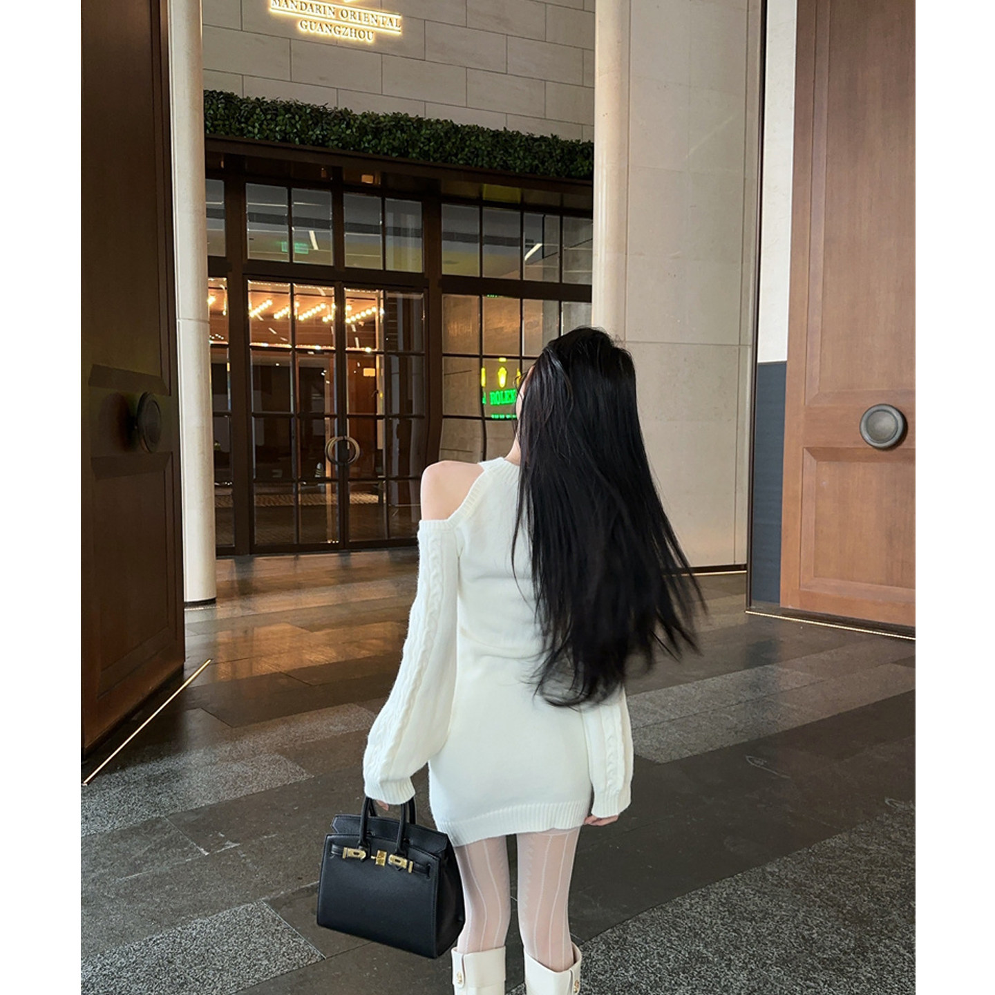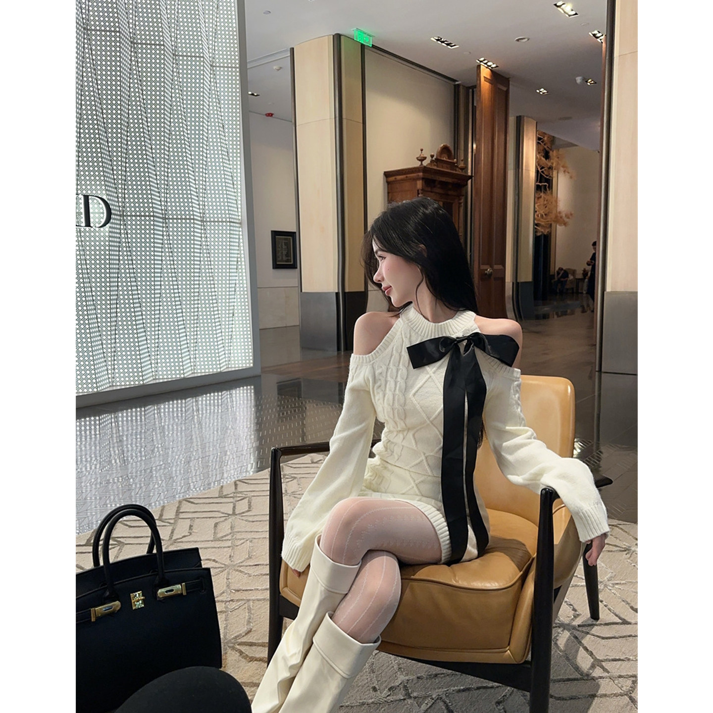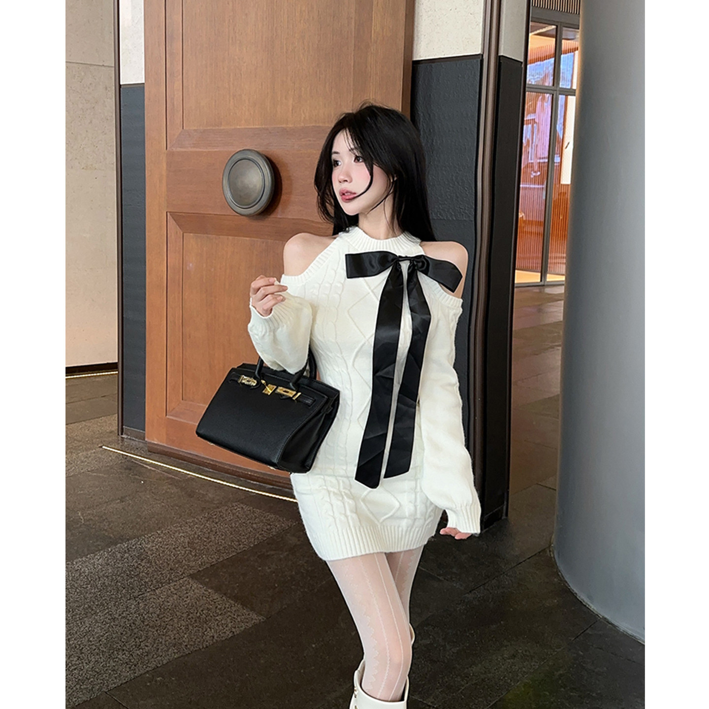 小心机露肩长袖蝴蝶结白色针织连衣裙秋冬性感纯欲修身包臀毛衣裙