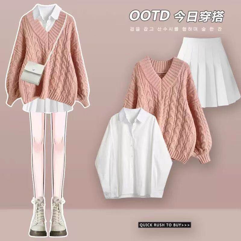 秋冬装新款套装温柔气质针织毛衣衬衫百褶裙小个子韩剧穿搭三件套