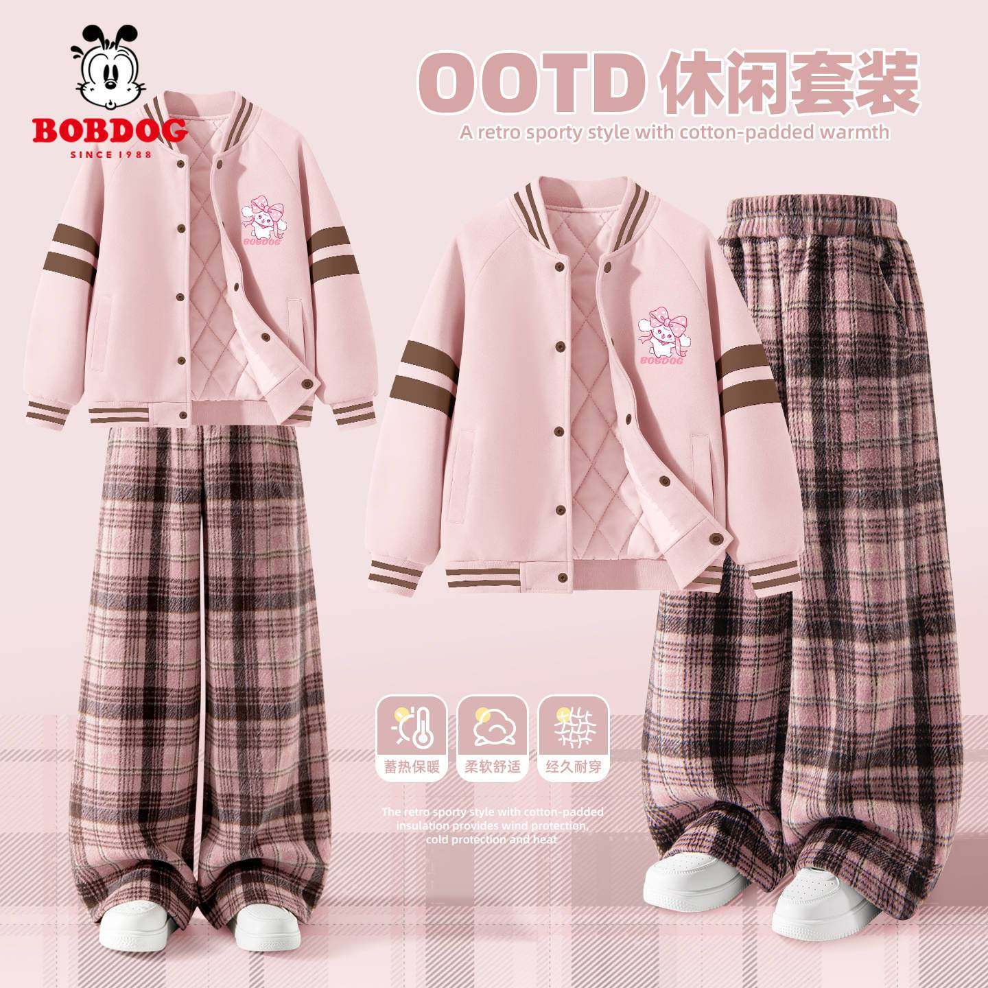 巴布豆女童冬装套装2026新款洋气时髦女孩棒球服外套加厚儿童裤子
