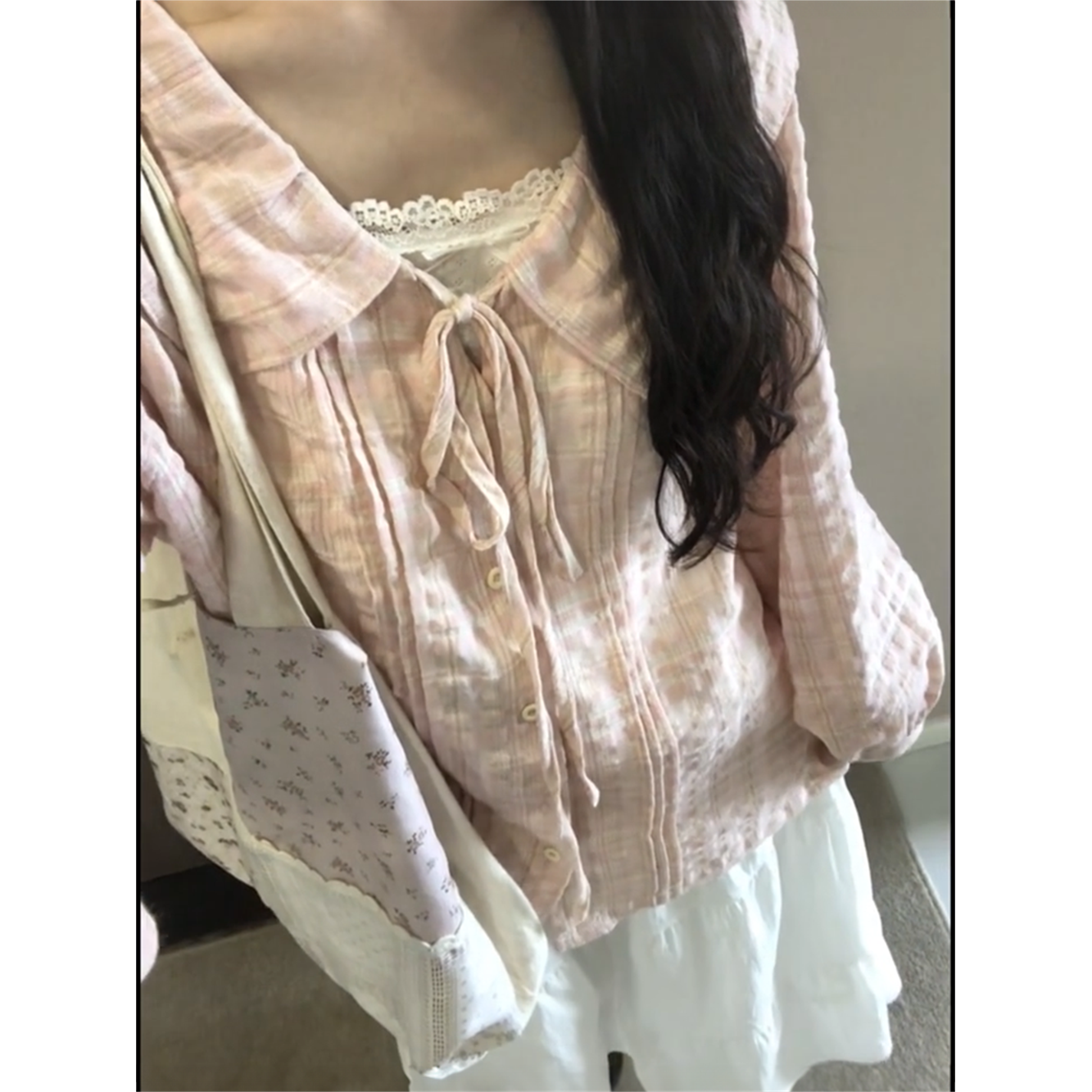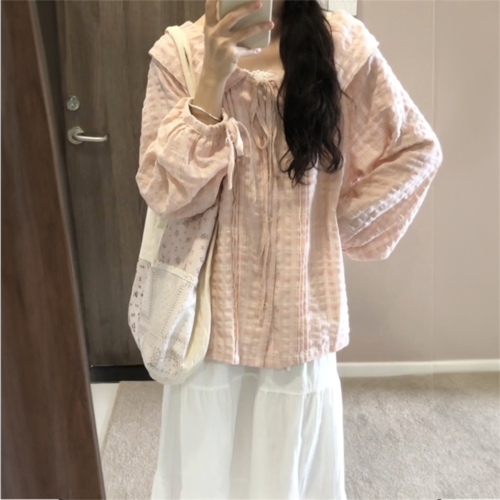 秋季新款日系甜美娃娃领格纹衬衫+高腰松紧半身裙学生女时尚套装