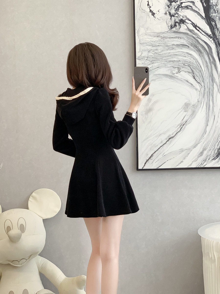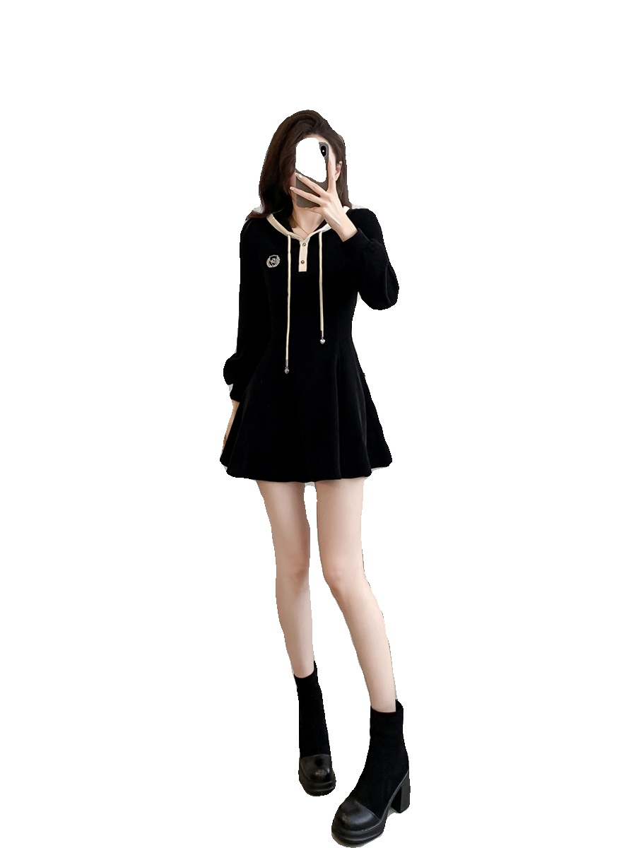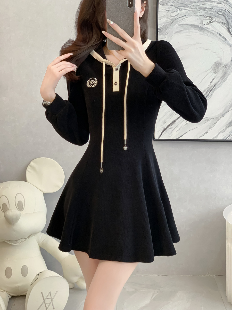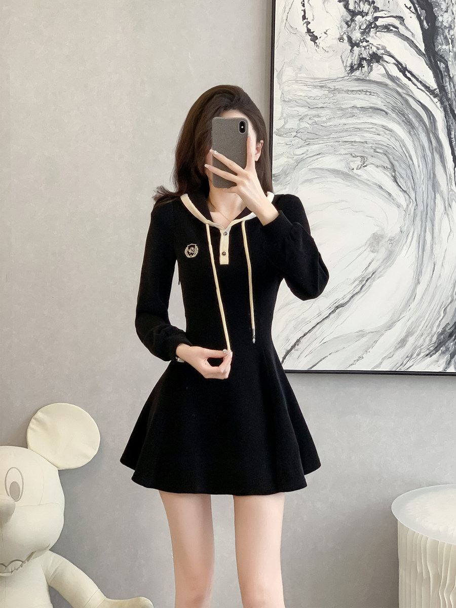 学院风长袖连帽收腰卫衣裙女2026春装新款甜美减龄针织连衣裙短裙