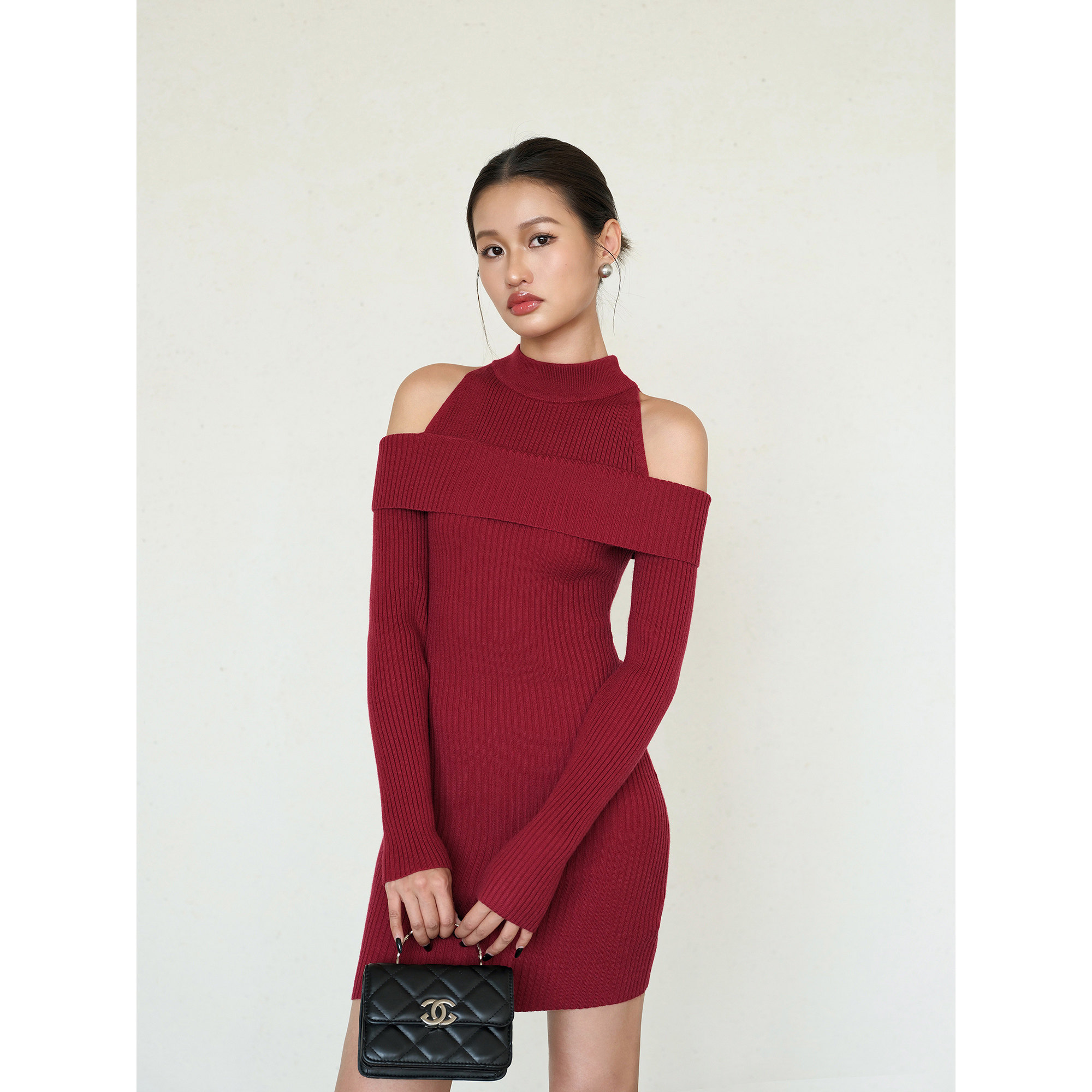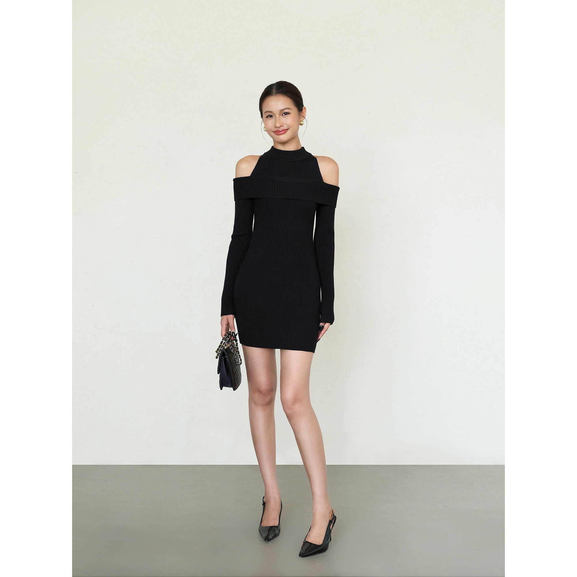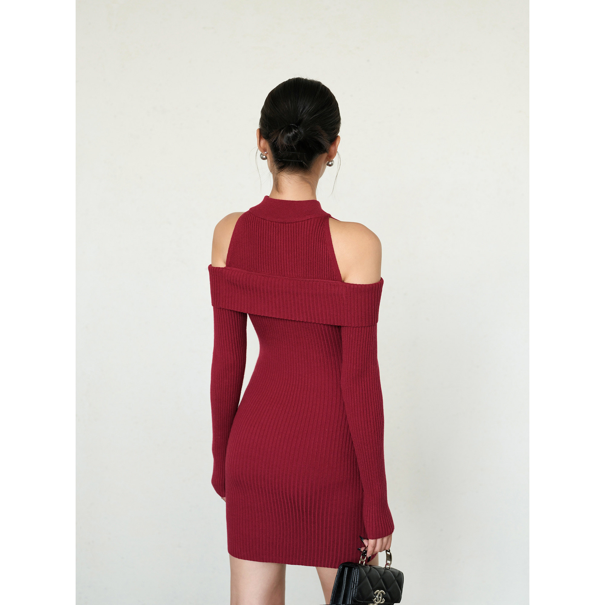 ousph雾都恋人 半高领露肩长袖针织连衣裙女气质修身内搭包臀短裙