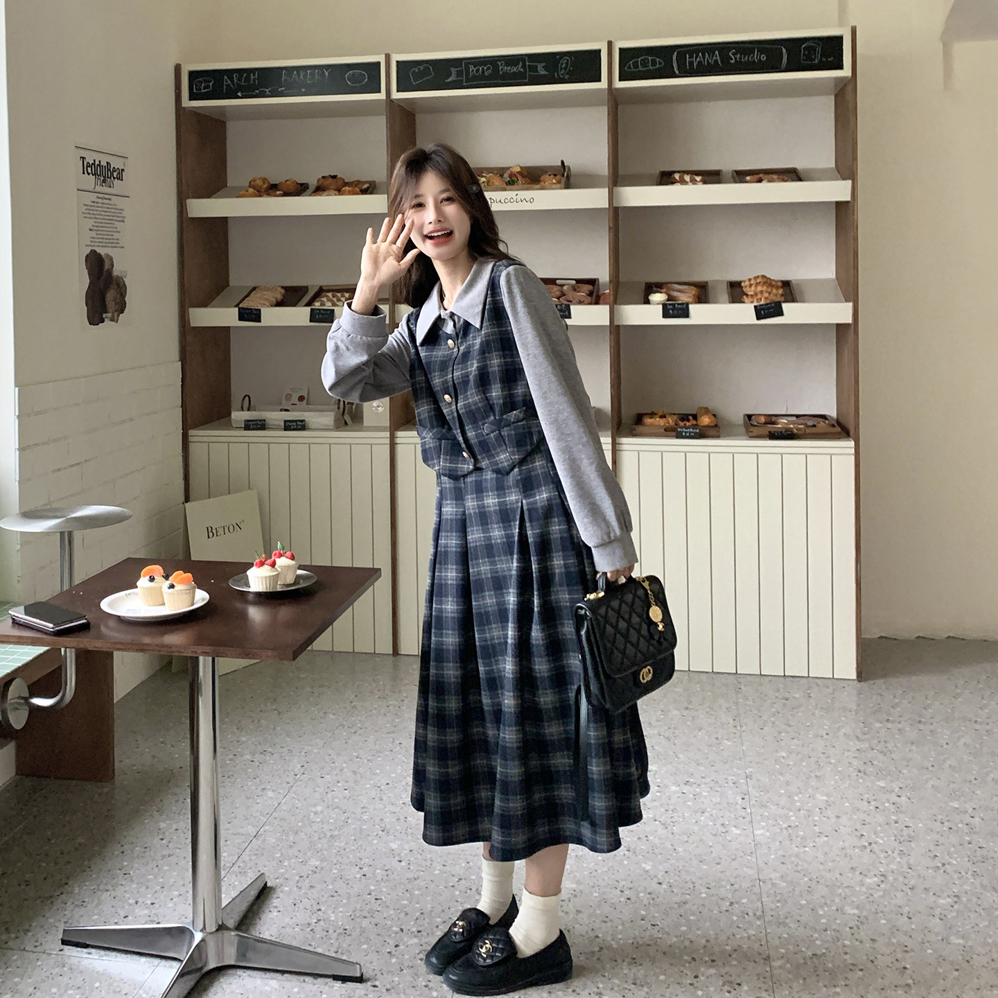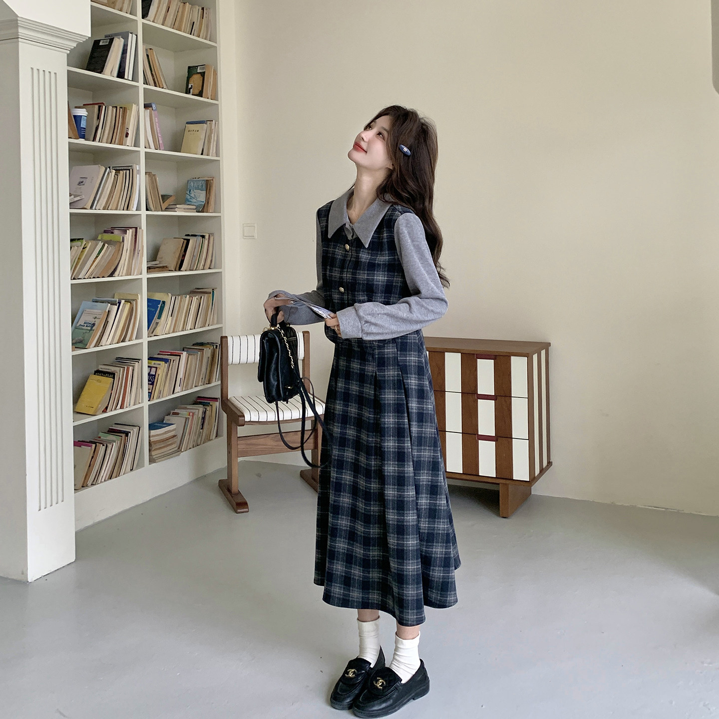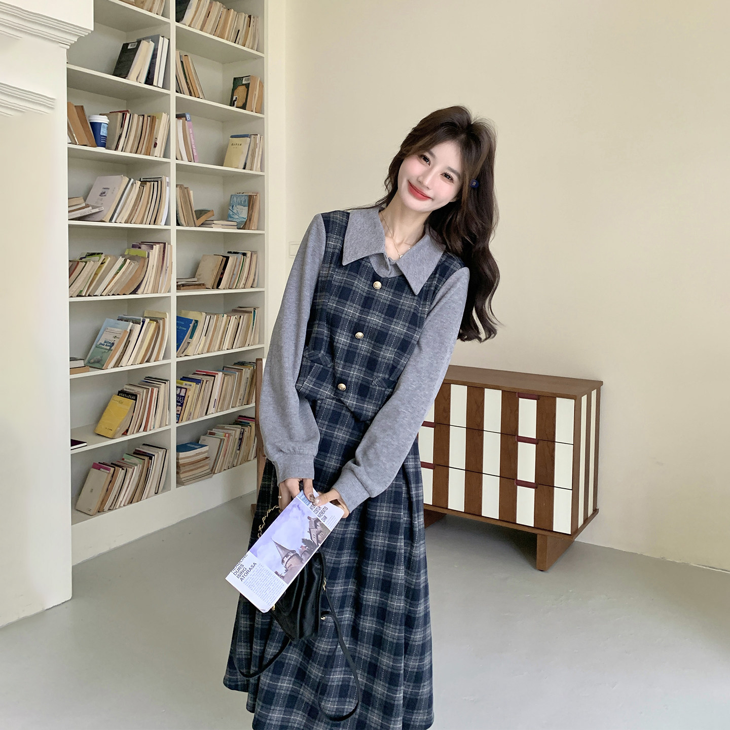 俏皮减龄假两件格纹拼接连衣裙女春季2026新款学院风流行爆款长裙