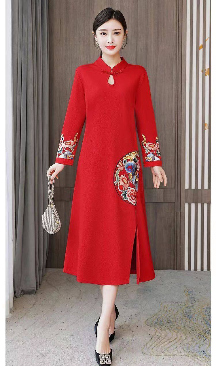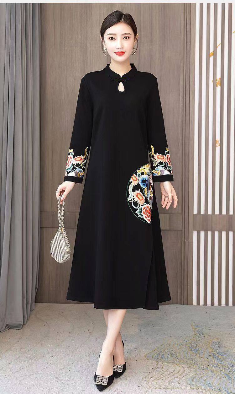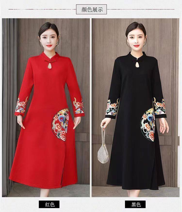 300斤胖mm大码刺绣改良旗袍裙子春秋冬宽松遮肚中长款绣花连衣裙