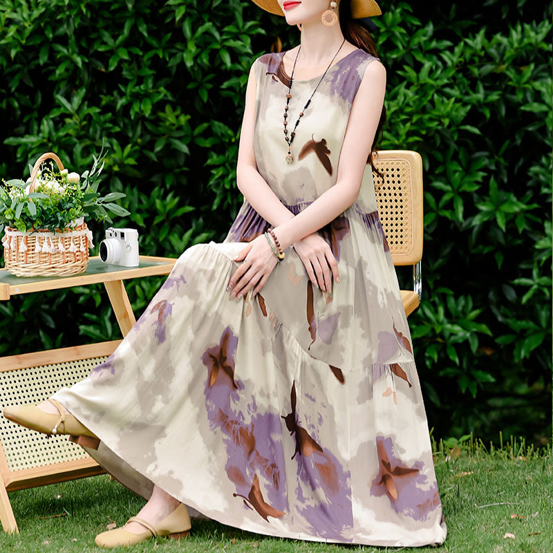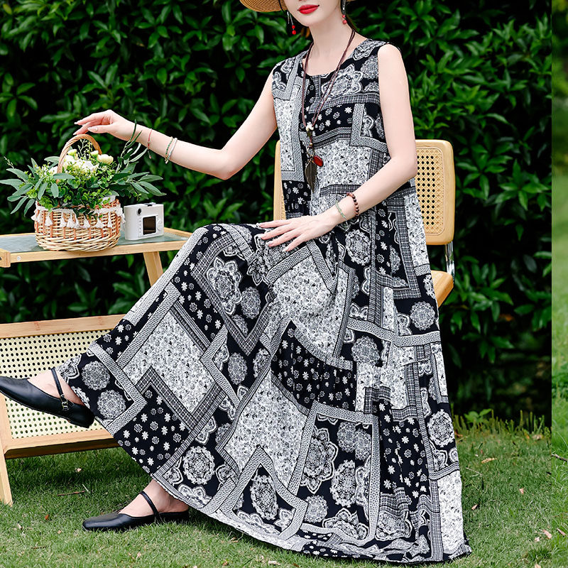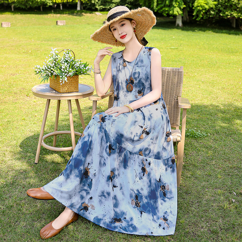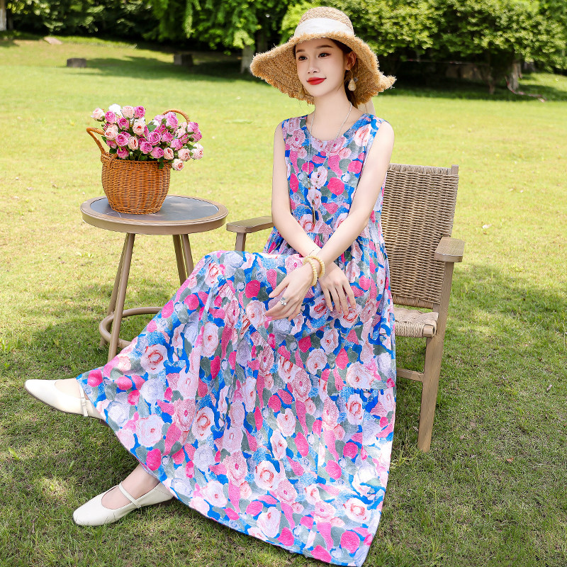 高端无袖年轻款棉绸连衣裙女夏季海边度假大码中年三亚裙子沙滩裙
