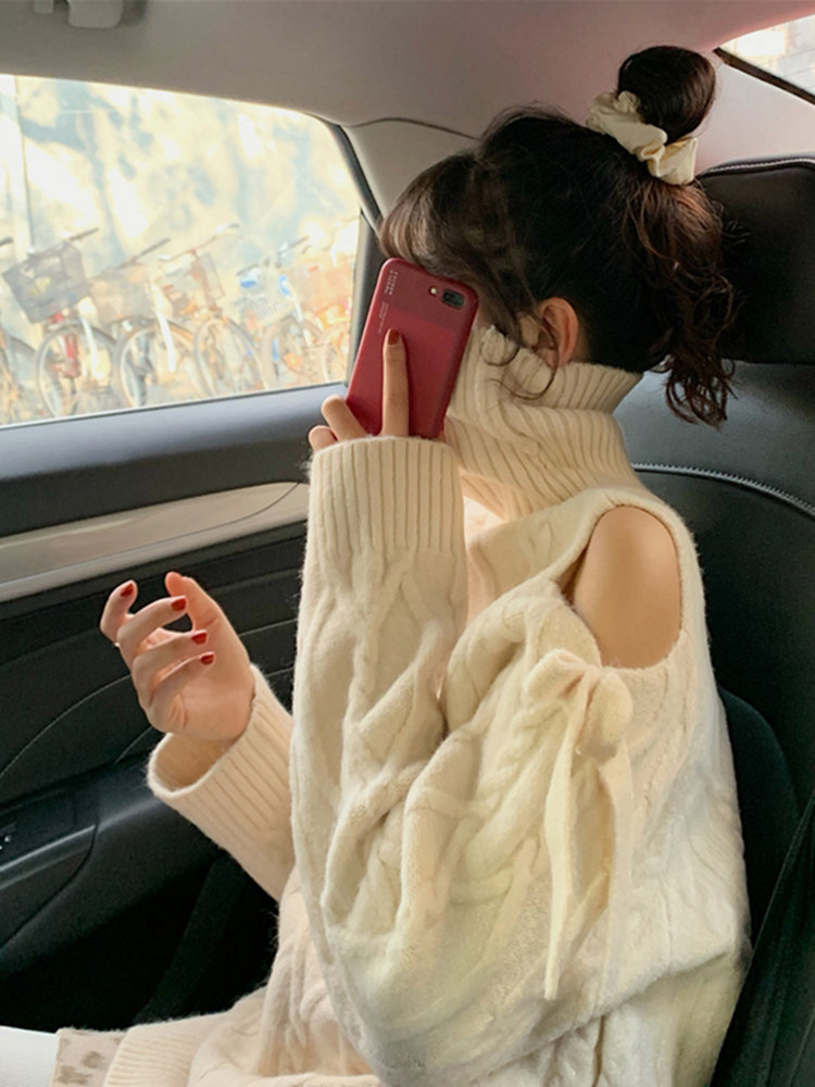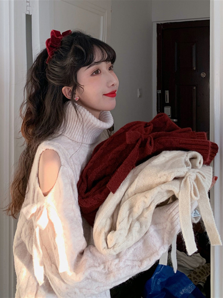 性感秋冬小个子蝴蝶结露肩毛衣裙女圣诞节红色连衣裙宽松新年过年