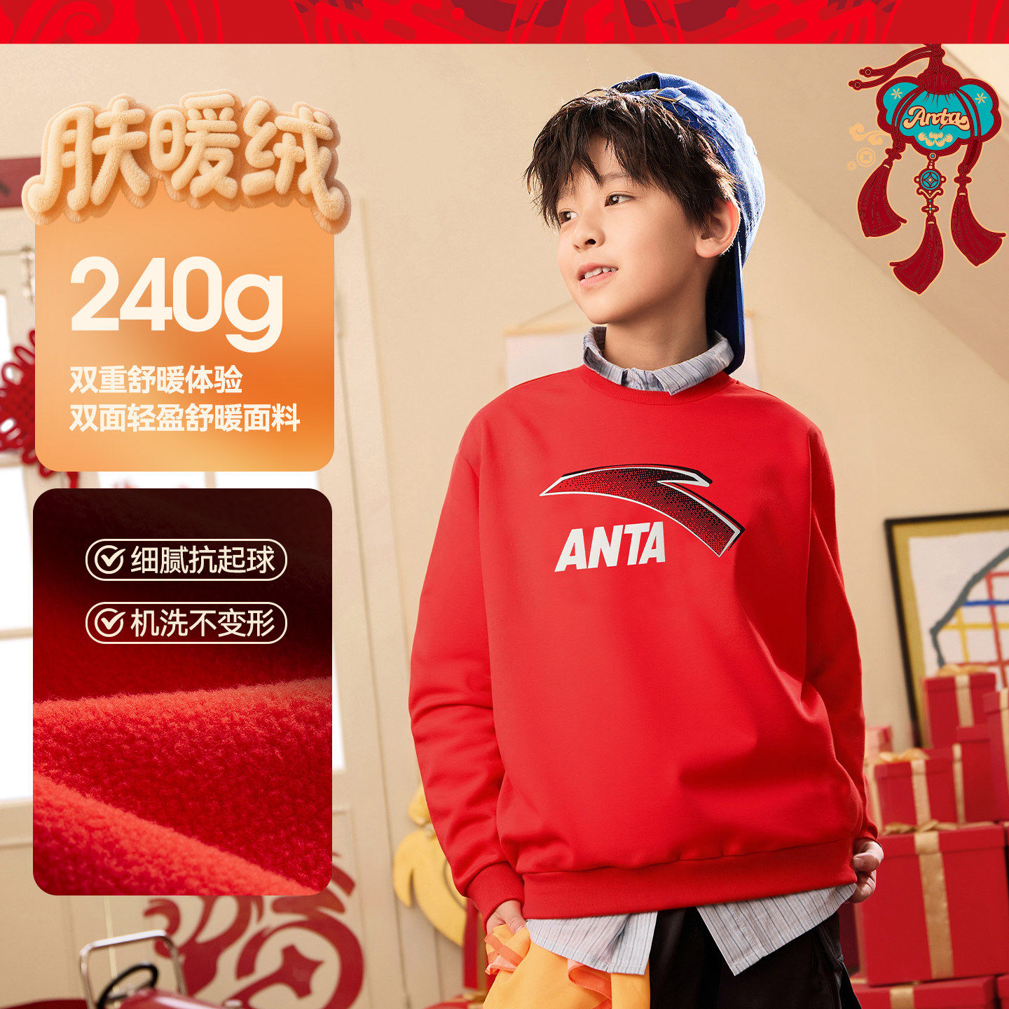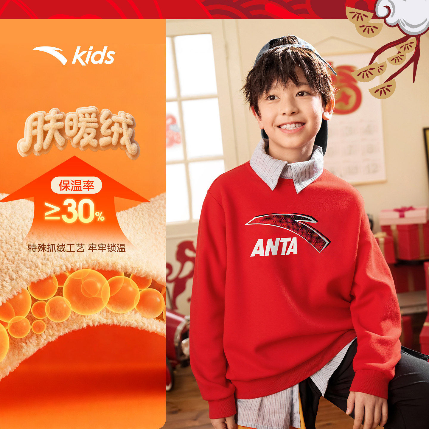 安踏儿童卫衣丨2026年春季女童红色新年运动保暖上衣男童
