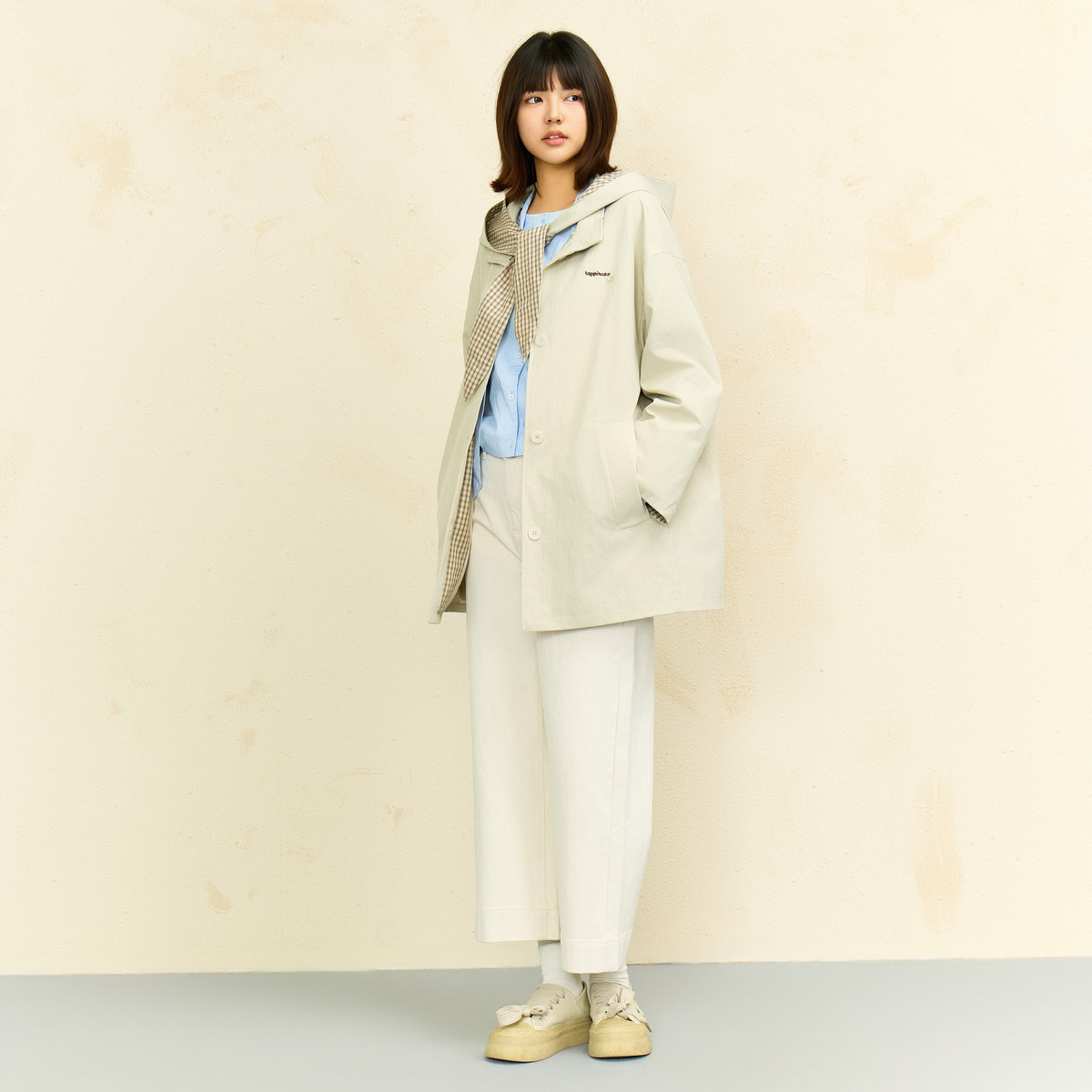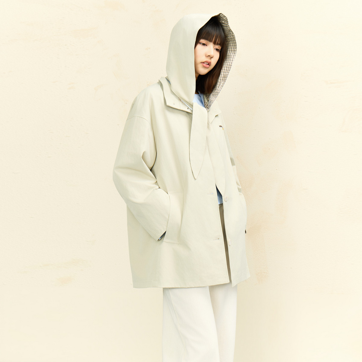 西町村屋韩系格纹拼接外套女2026春新款中长款风衣含帽XHBA10292