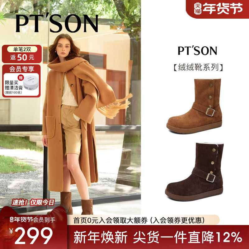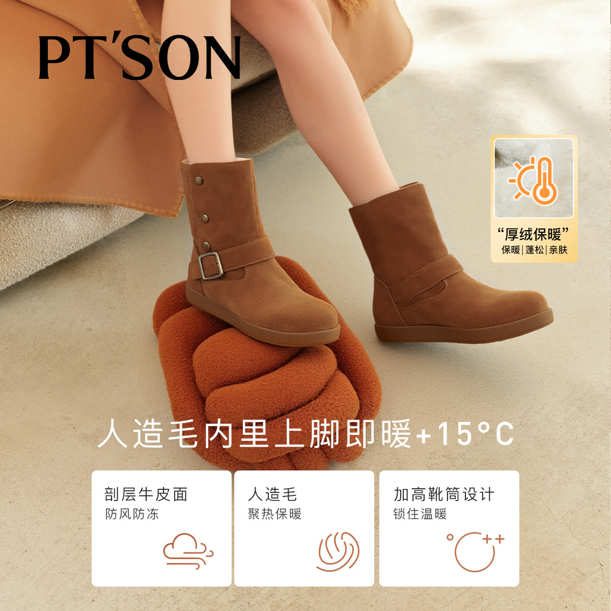 百田森保暖雪地靴女款2025新款冬季厚底加绒勃肯鞋一脚蹬真皮女鞋