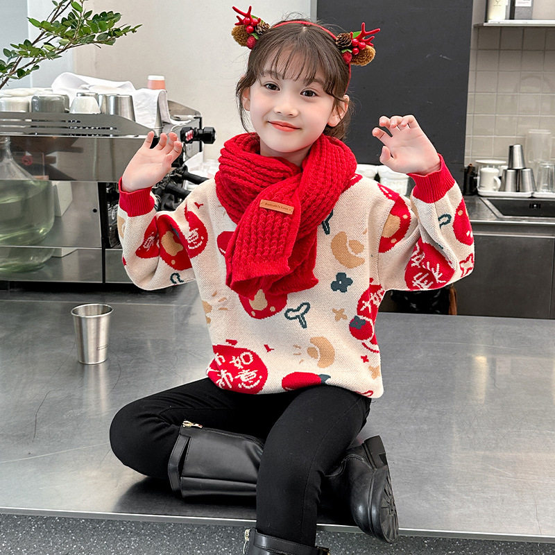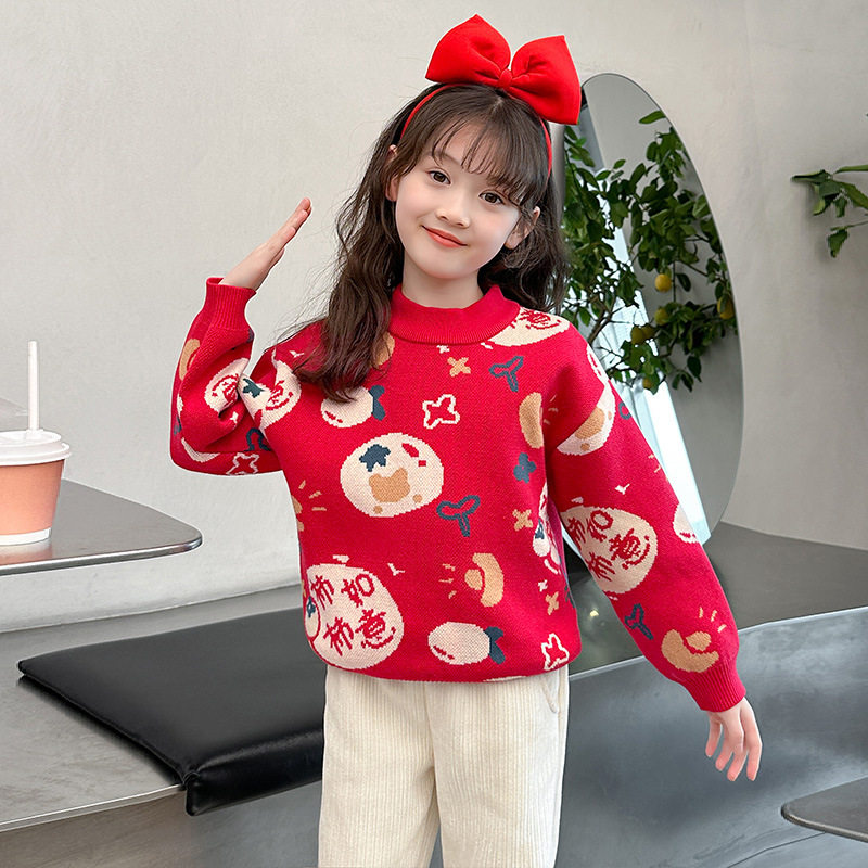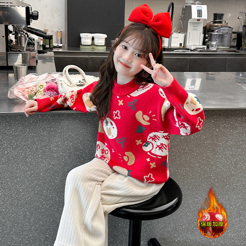 女童红色毛衣拜新年服2026春秋冬新款加绒加厚针织衫套头打底衫潮