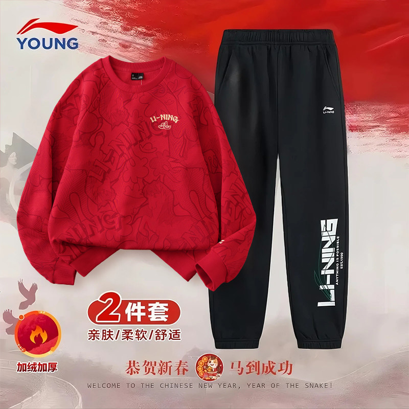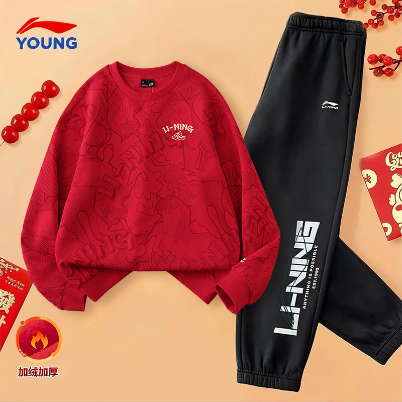 李宁儿童新年套装男童2026新款中大童加厚运动本命年拜年服套装
