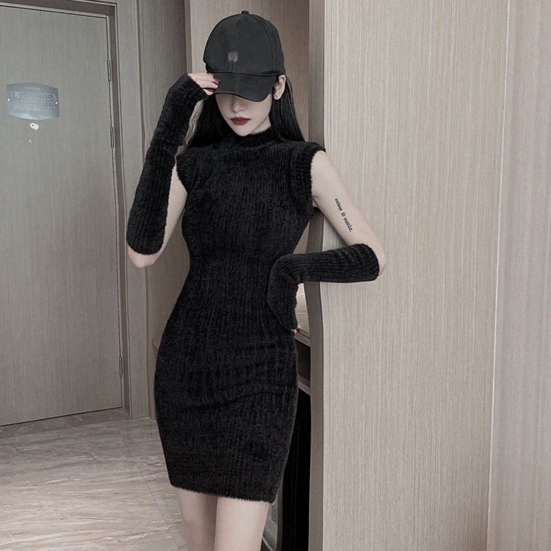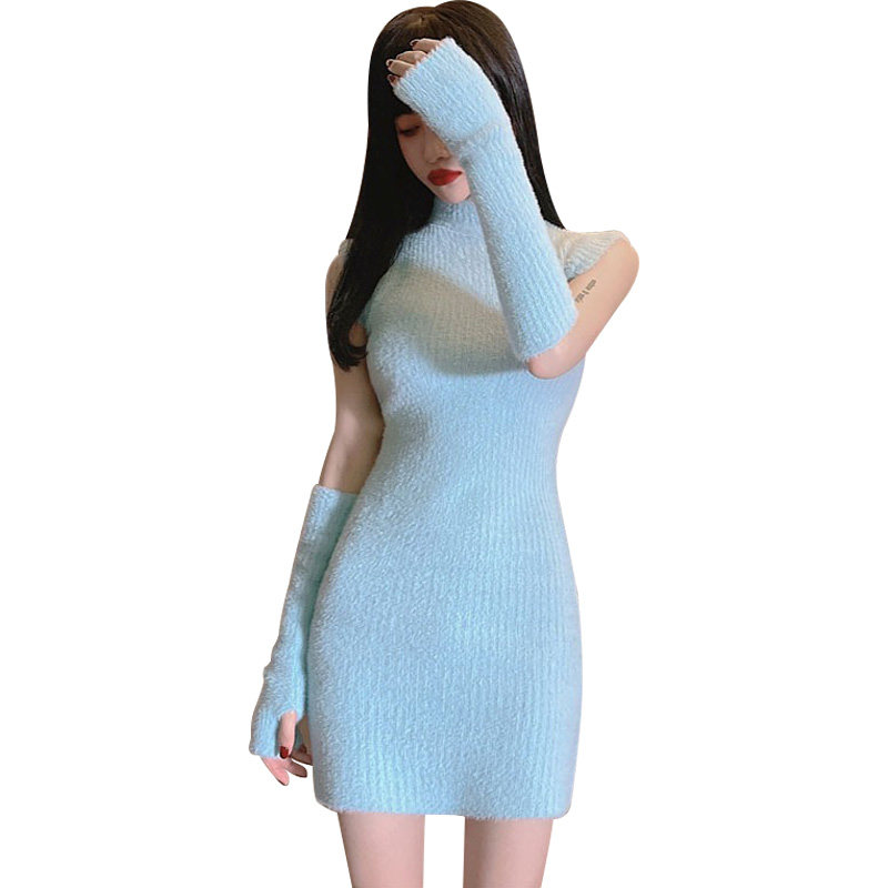 软糯甜辣妹性感紧身包臀短裙打底裙长袖内搭针织毛衣连衣裙女秋冬