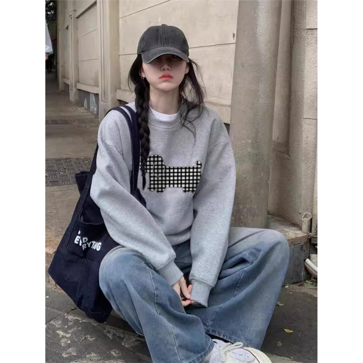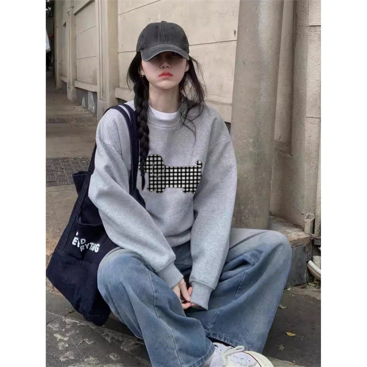 美式灰色正肩无帽卫衣女款加绒加厚内搭打底衫圆领宽松慵懒风上衣