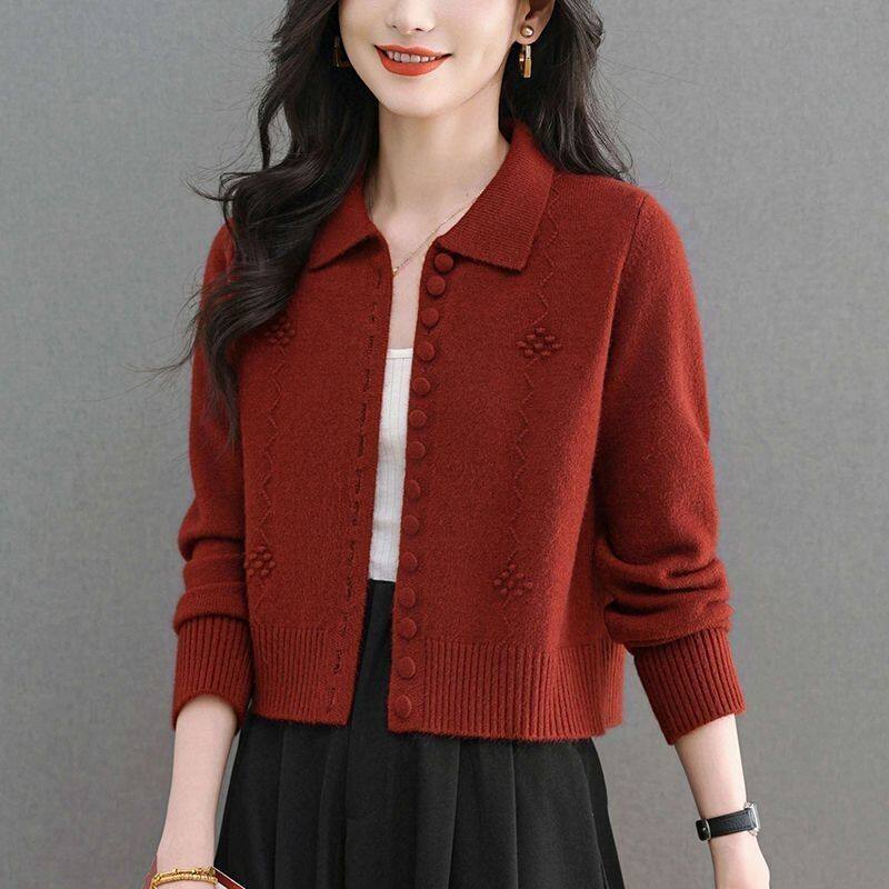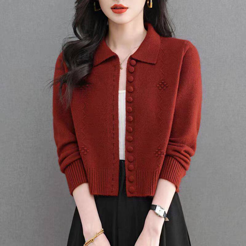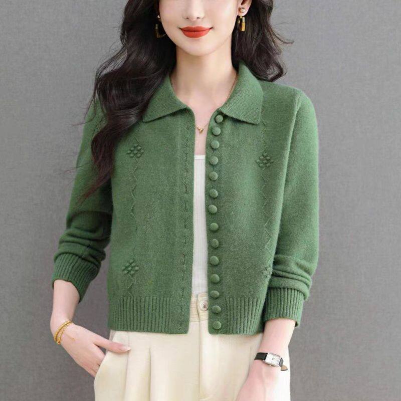 东莞大朗短款针织衫不起球女新款正品广州十三行翻领开衫毛衣外套