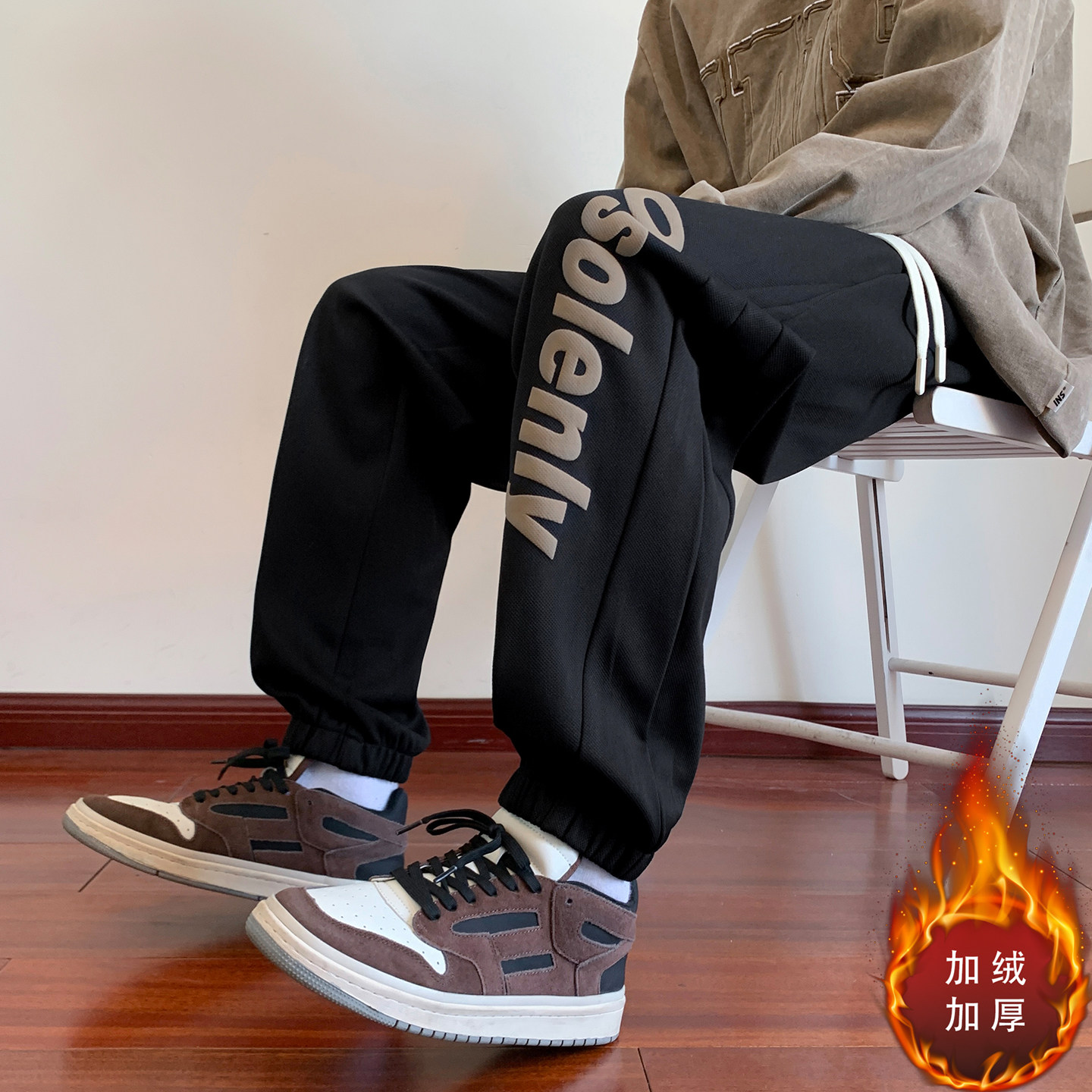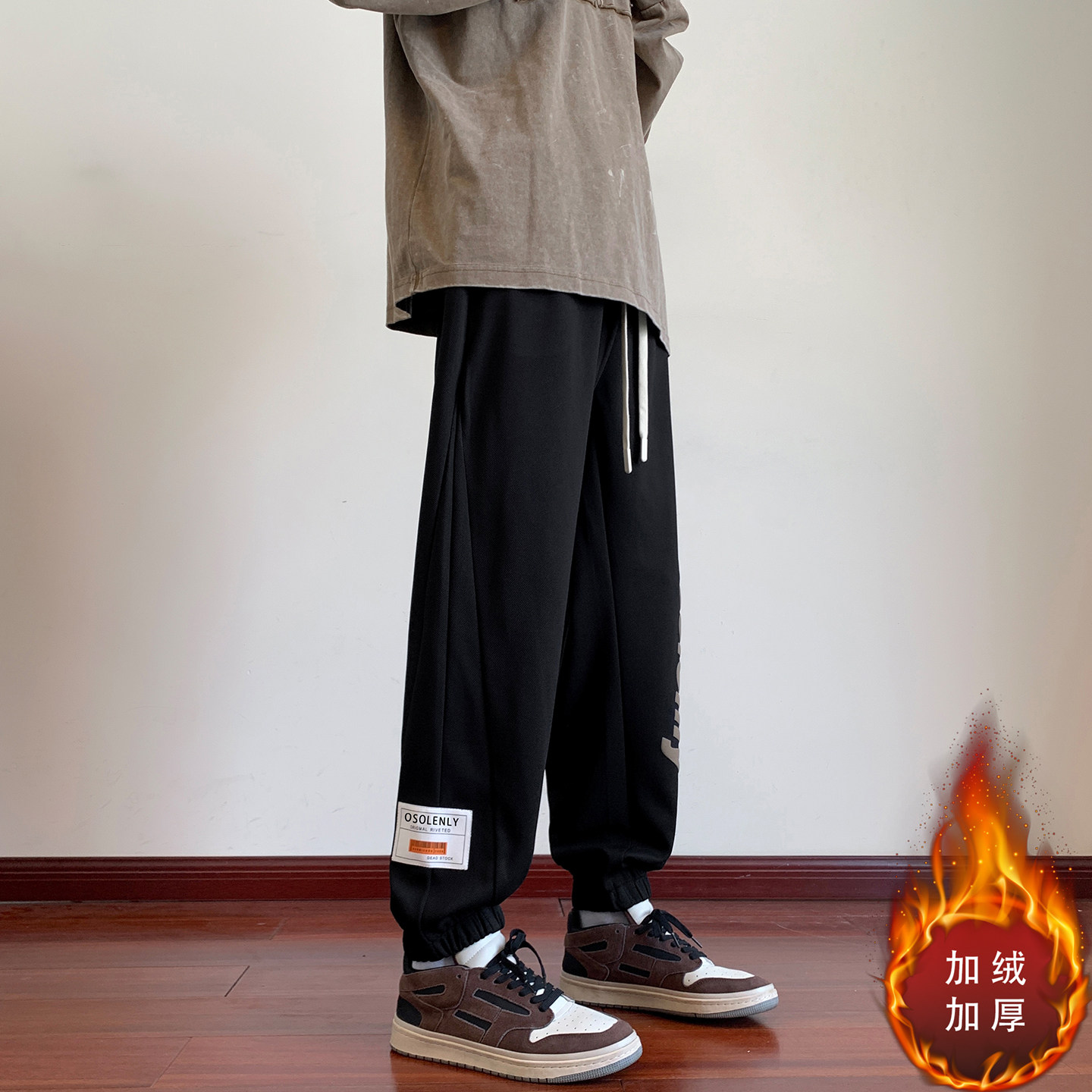 黑色束脚卫裤男款冬季美式hiphop大码宽松裤子重磅加绒加厚休闲裤