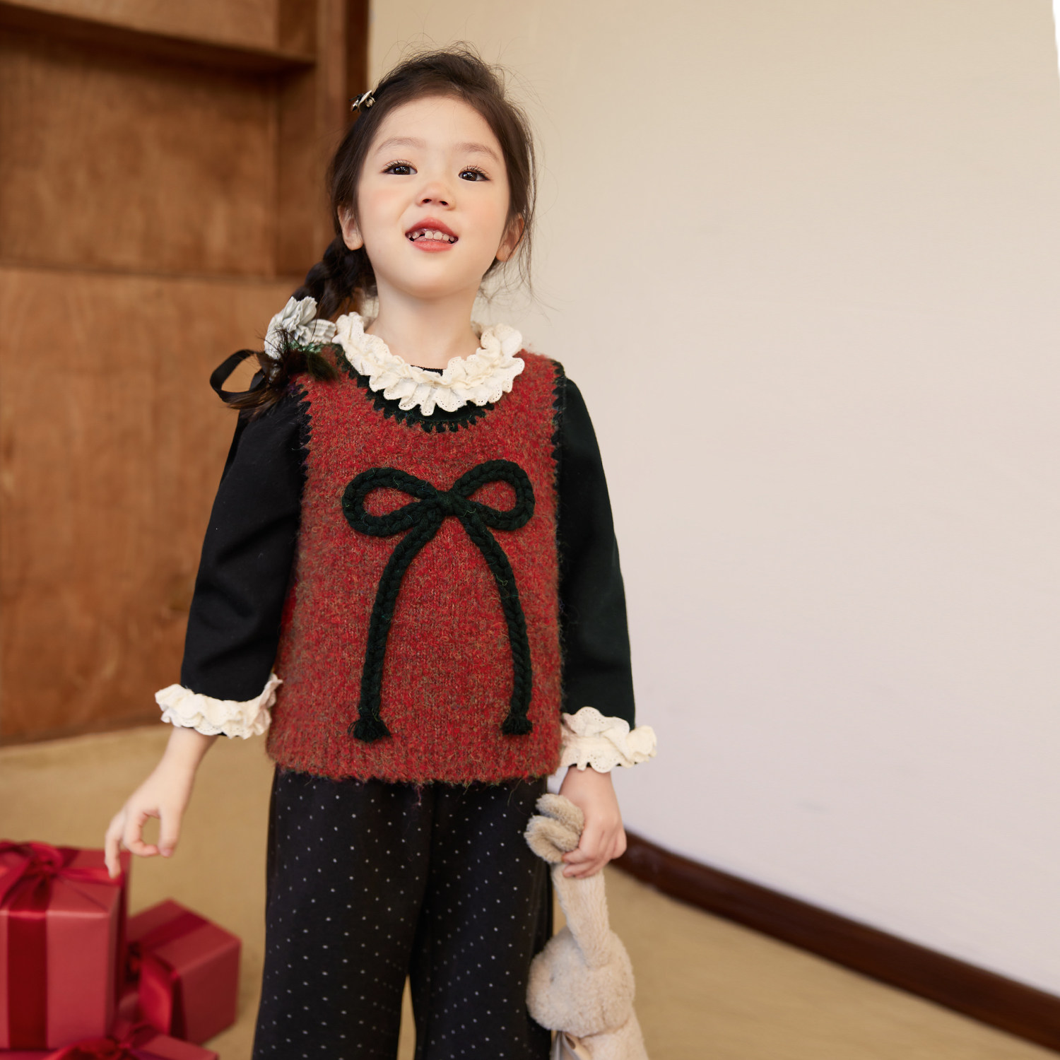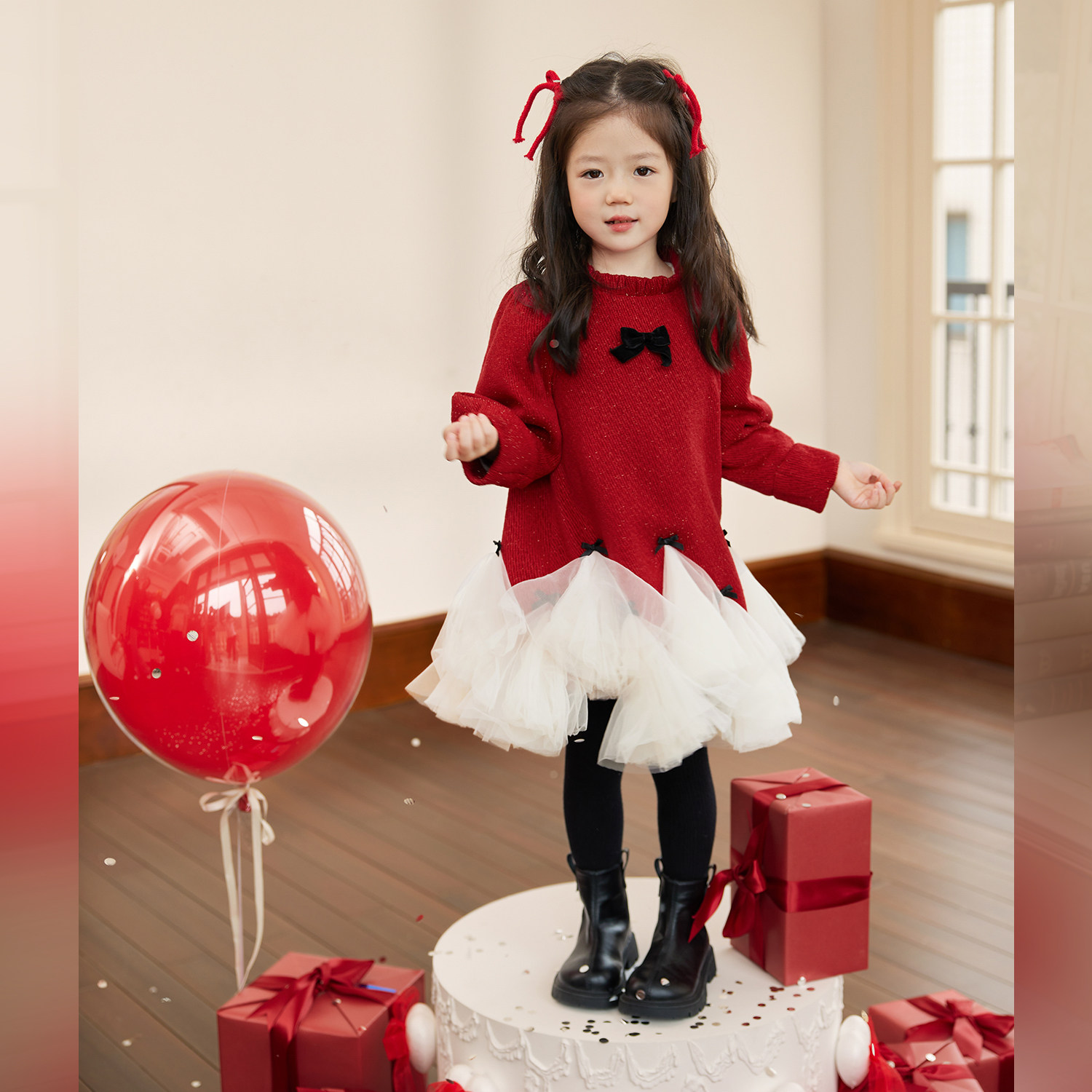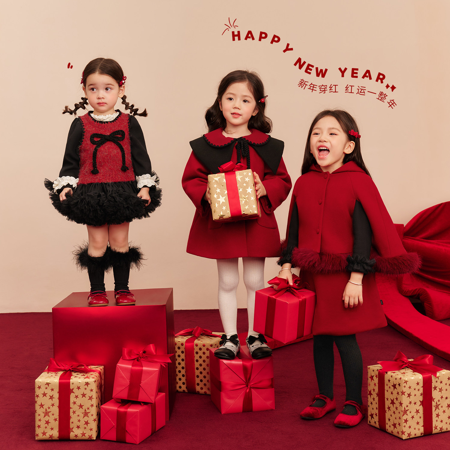 NORNOR童装女童新年红色套装保暖冬季新款好看小香风连衣裙过年服