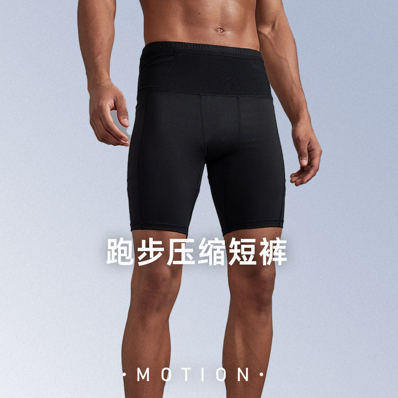 带腰包高弹力运动紧身压缩裤马拉松男跑步田径五分健身裤速干短裤