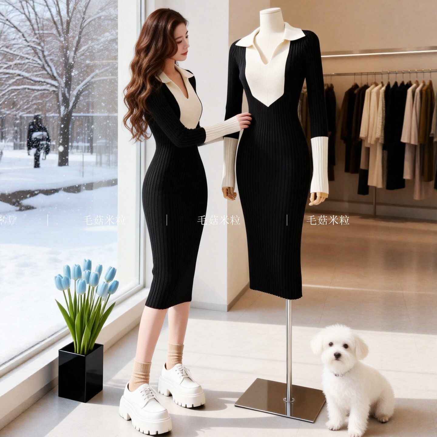 春装女款2026年新款针织连衣裙女秋季轻奢高级感翻领气质包臀长裙