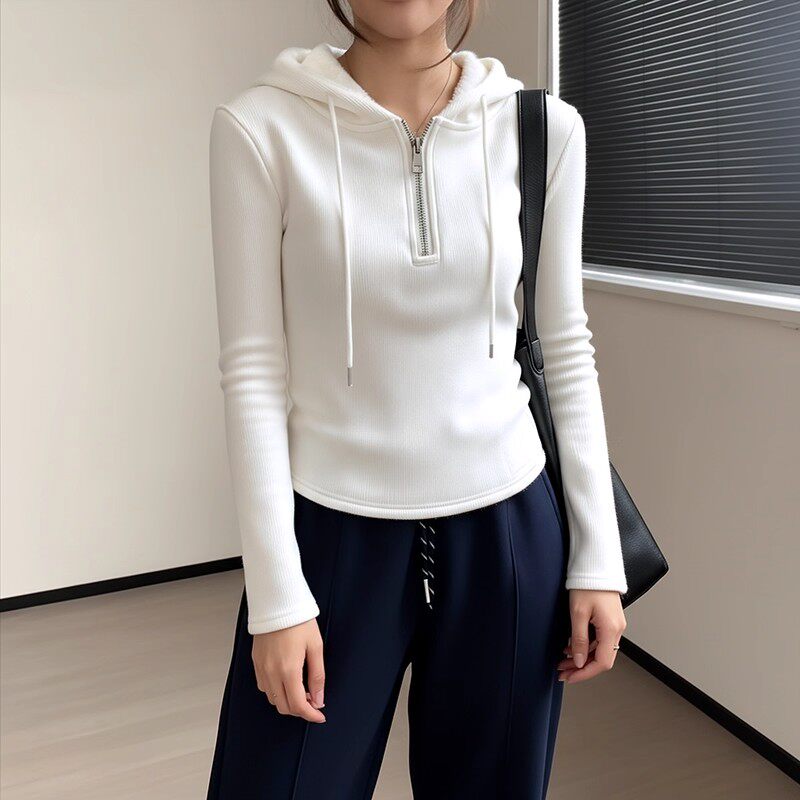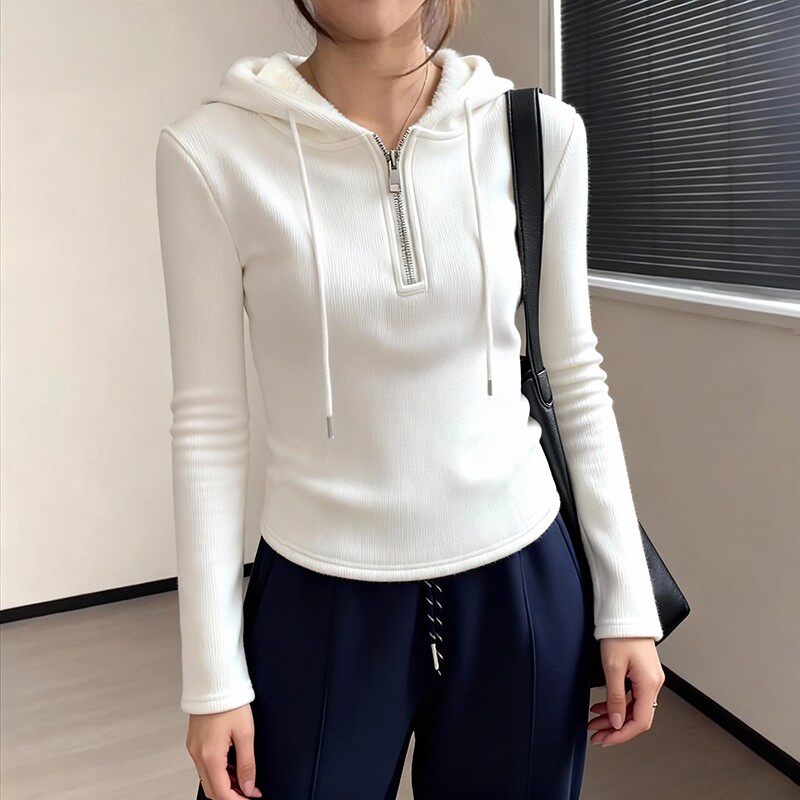 白色连帽加绒卫衣女款2025新款高腰修身短款上衣女正肩半拉链帽衫