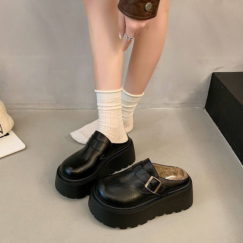 日本进口包头半拖毛毛拖鞋女外穿棉鞋厚底增高8CM加绒勃肯鞋女秋