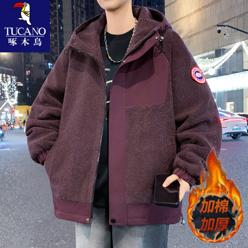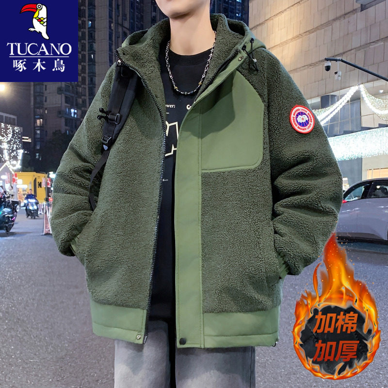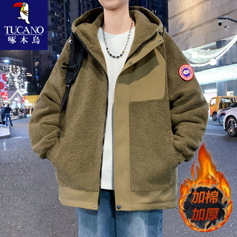 啄木鸟冬季羊羔绒外套男孩高中初中学生加绒加厚夹克大童冬装棉服