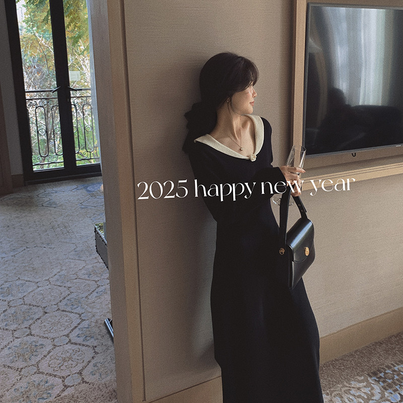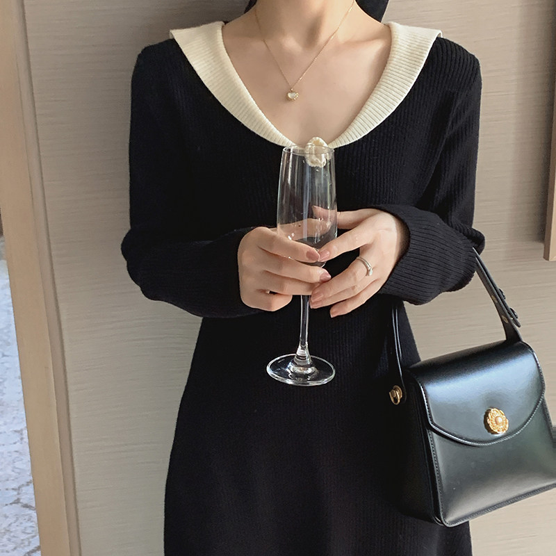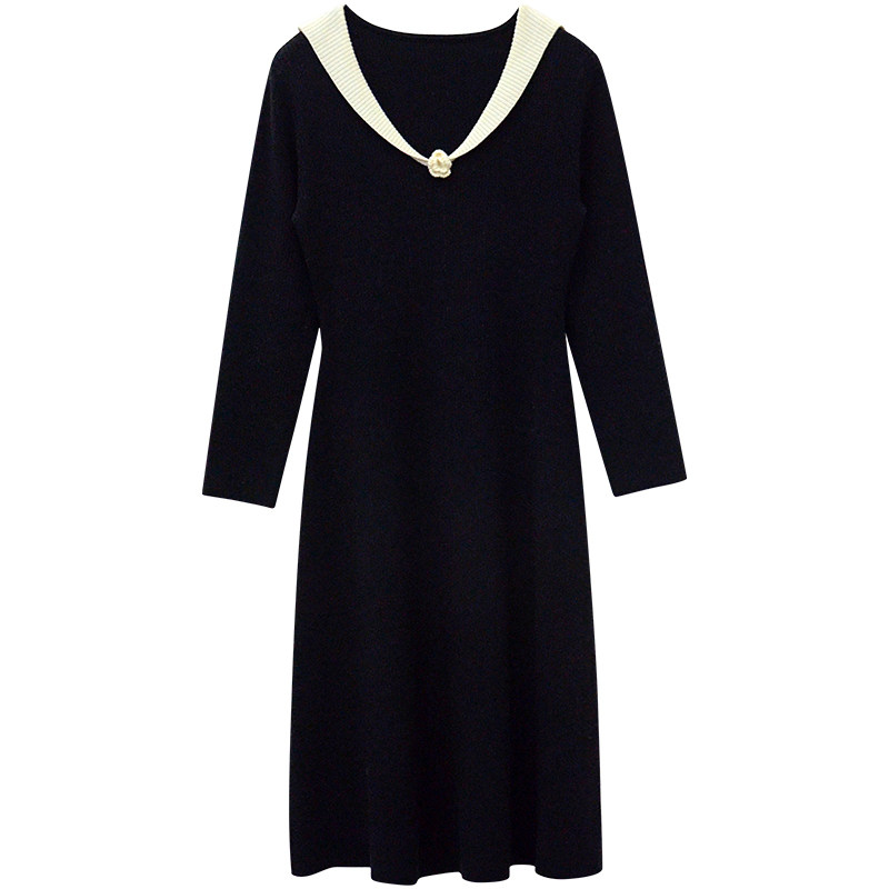 一三良品小个子手工钩花v领收腰修身黑色针织连衣裙长裙内搭裙冬