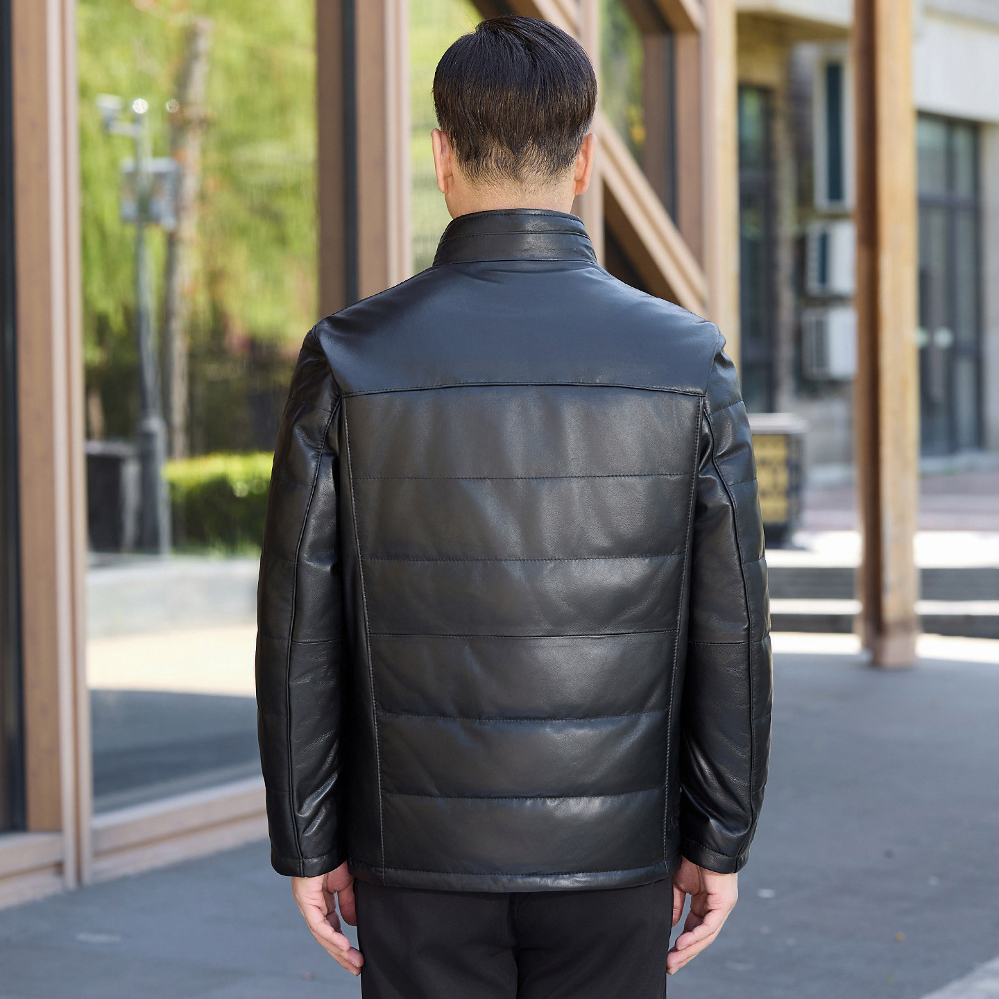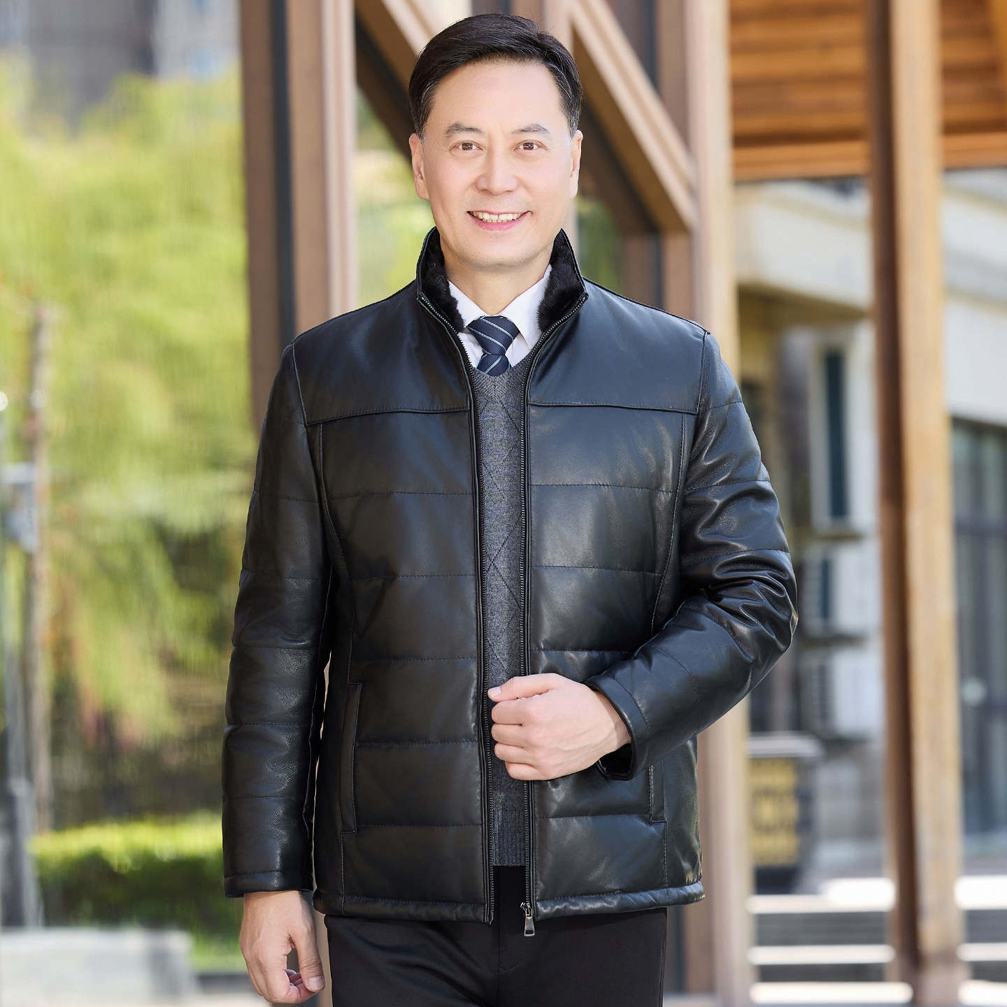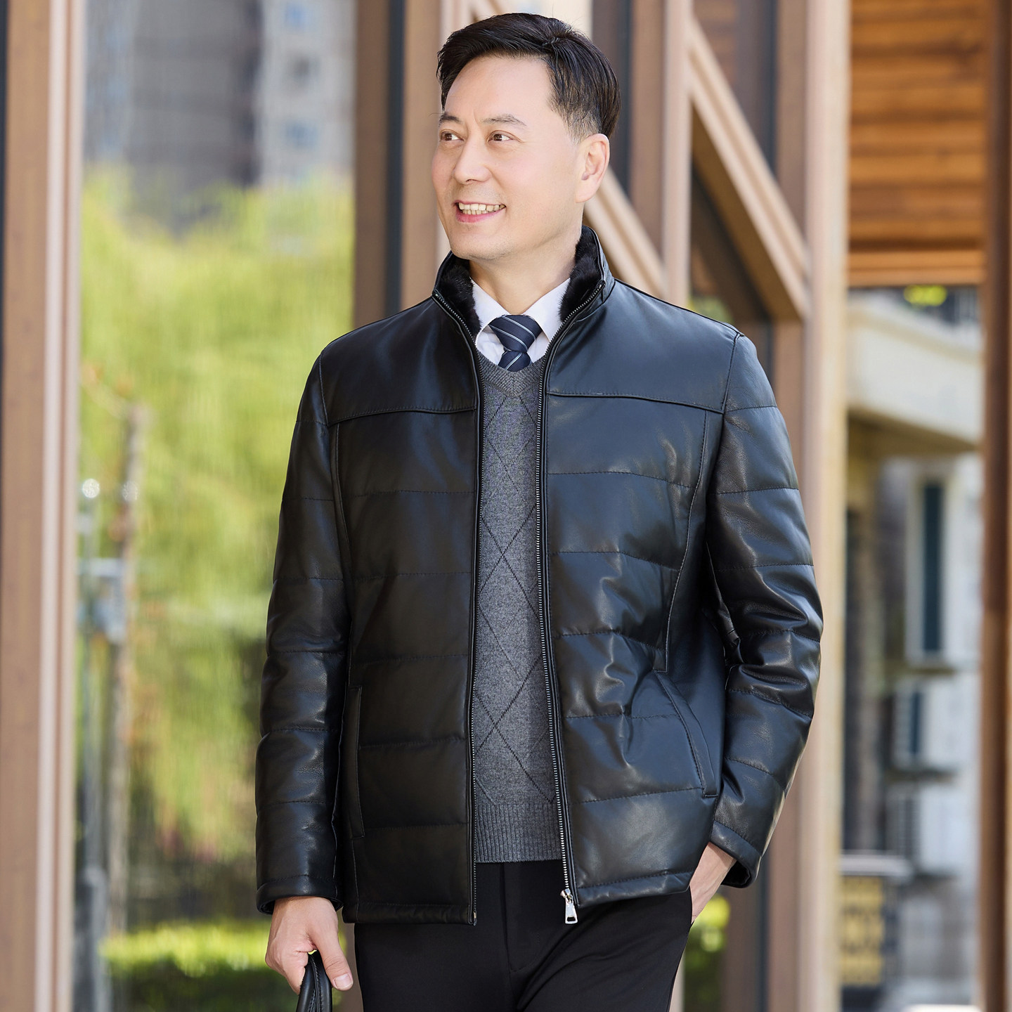 海宁真皮羽绒服男士短款中老年皮衣爸爸装水貂立领皮夹克加绒外套