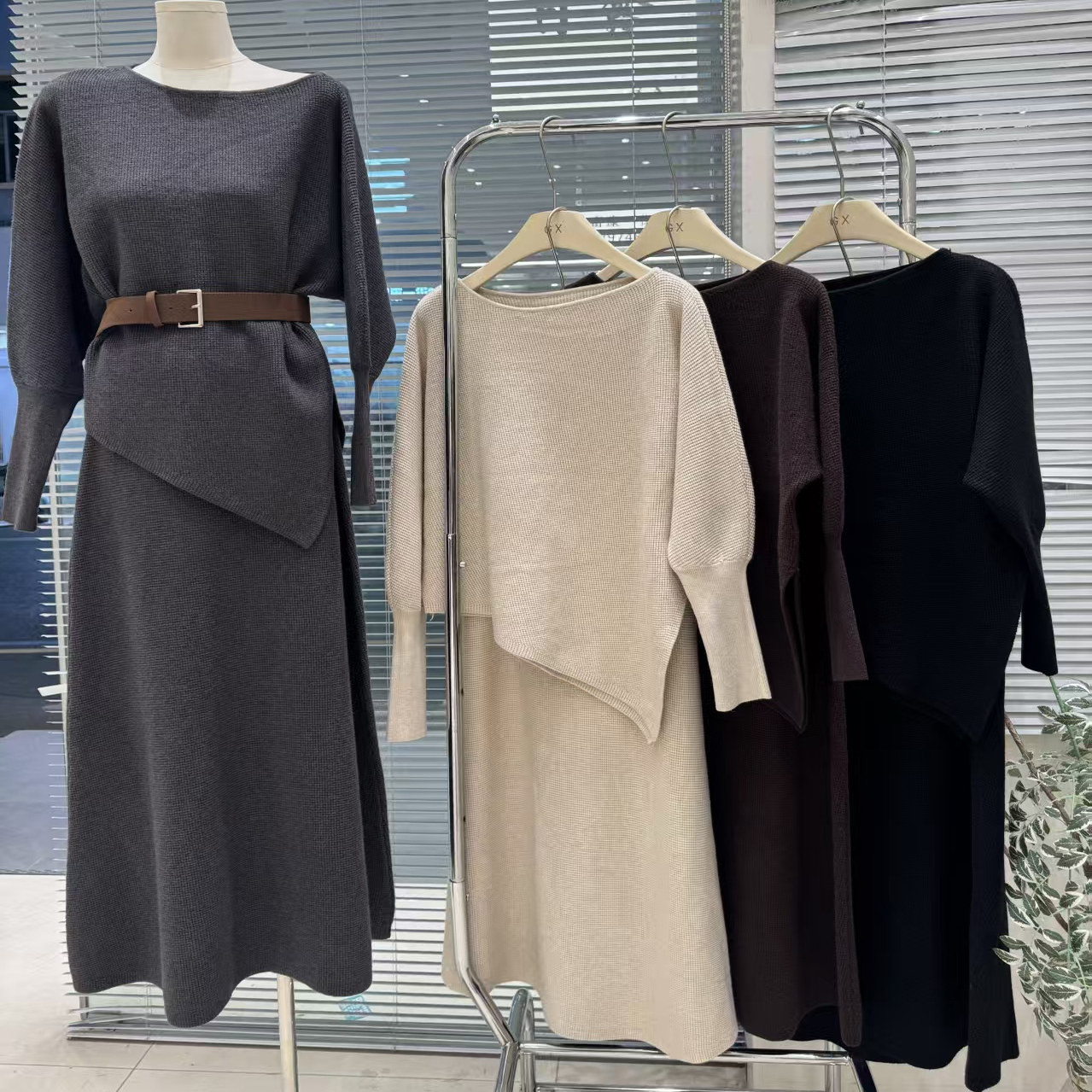 法式华夫格针织套装裙女冬季不规则针织上衣+气质半身裙 配腰带