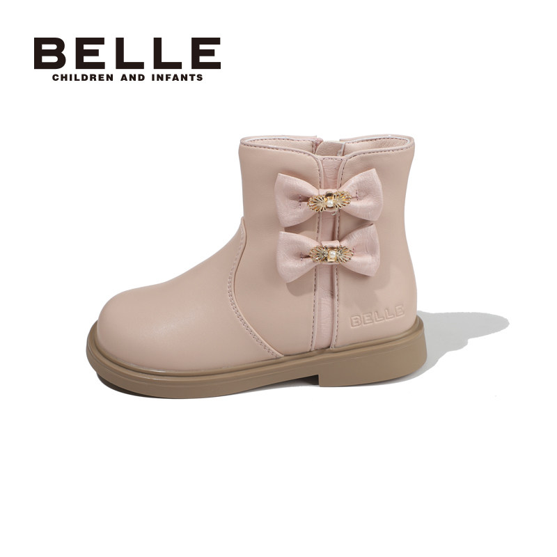 百丽童鞋女童蝴蝶结公主靴冬季加绒保暖儿童马丁靴时尚小女孩短靴