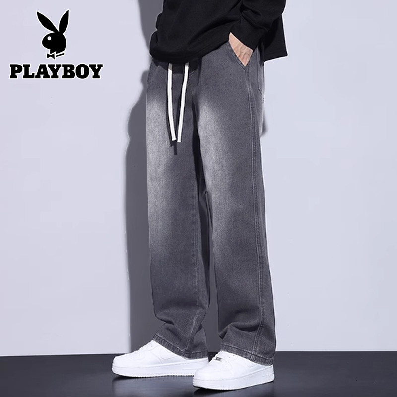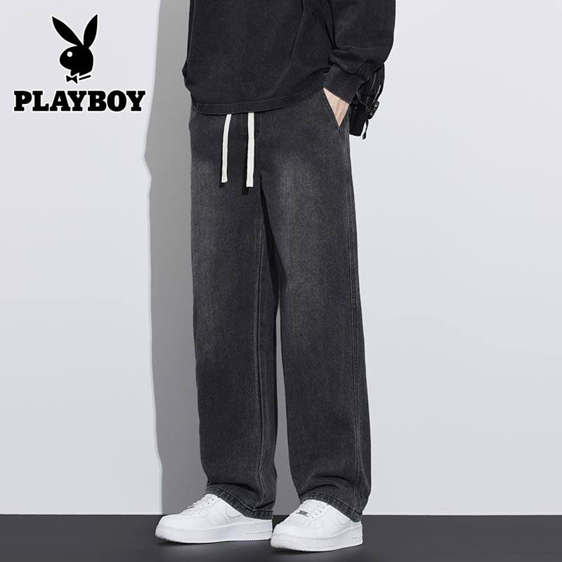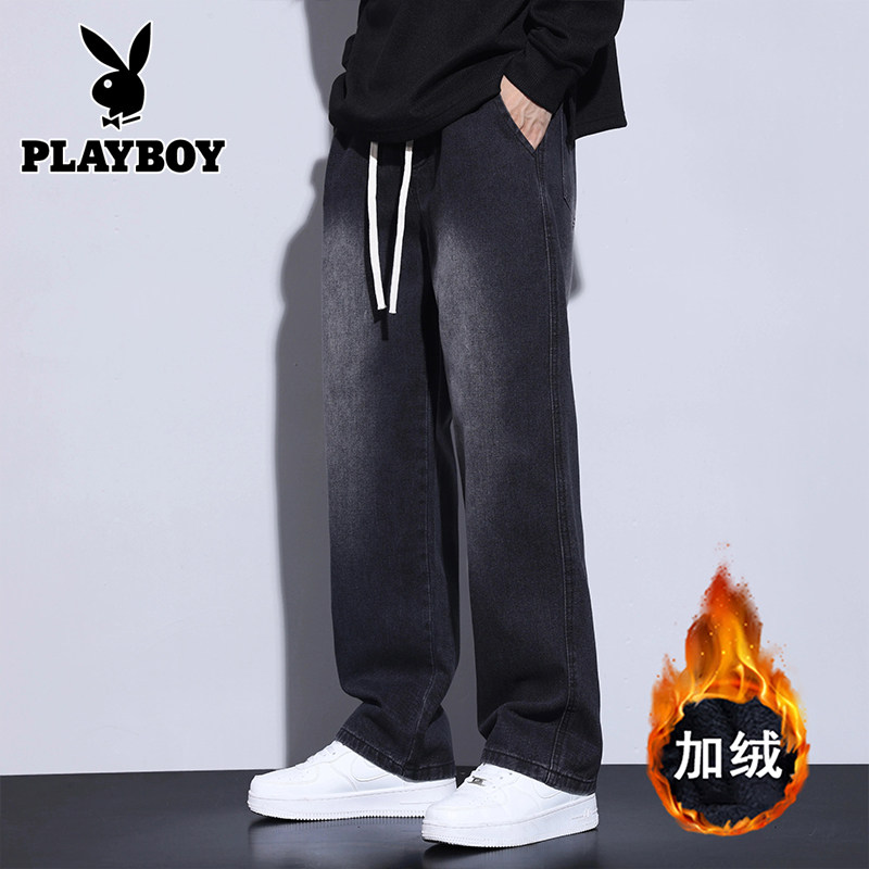 花花公子冬季加绒加厚牛仔裤男款宽松直筒阔腿潮牌百搭休闲长裤子