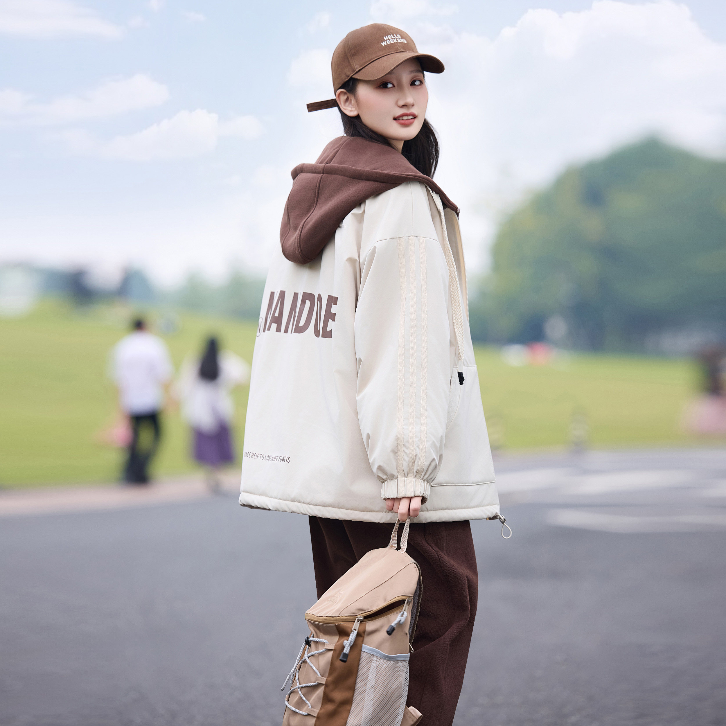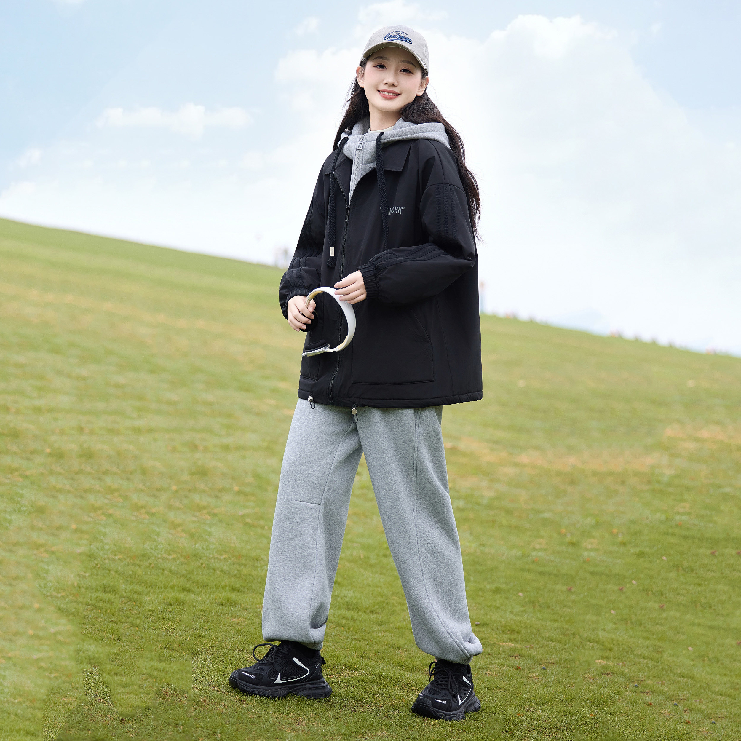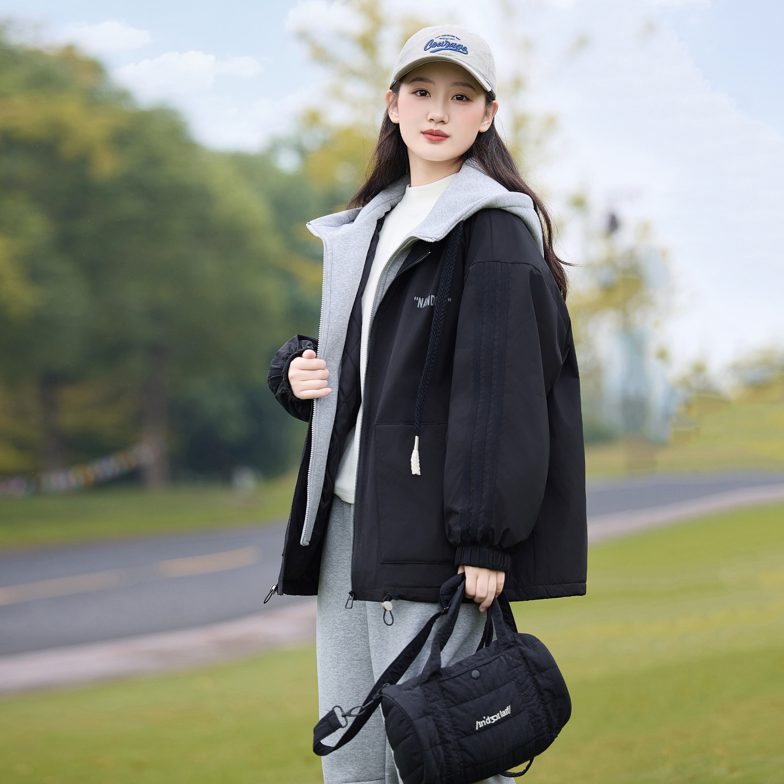 311线报网描述:中学生加绒外套女黑色短款加厚保暖棉服冬季