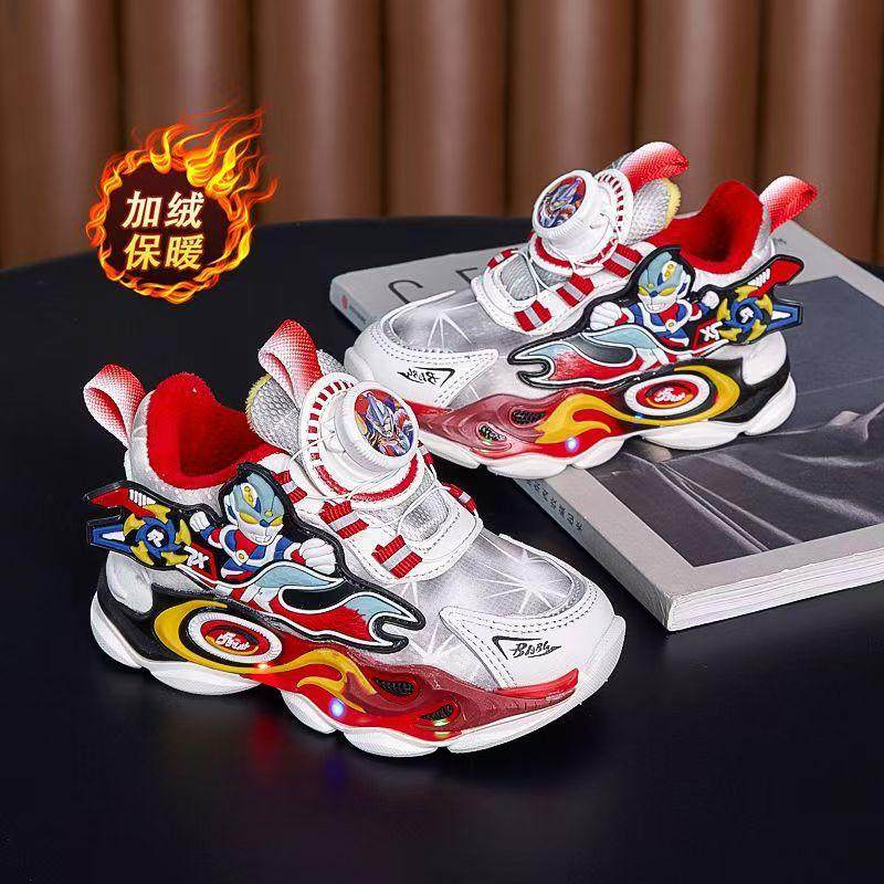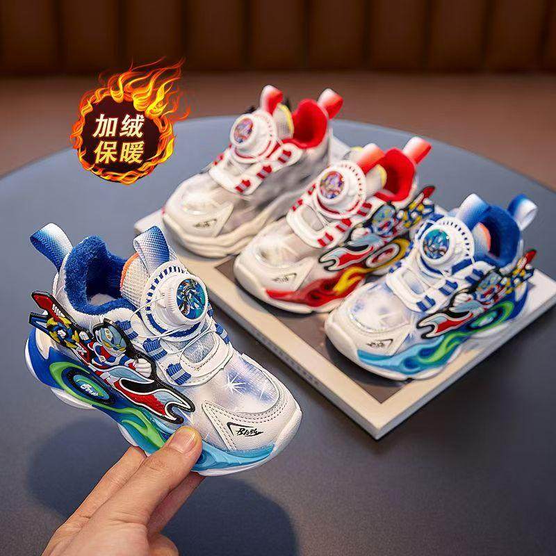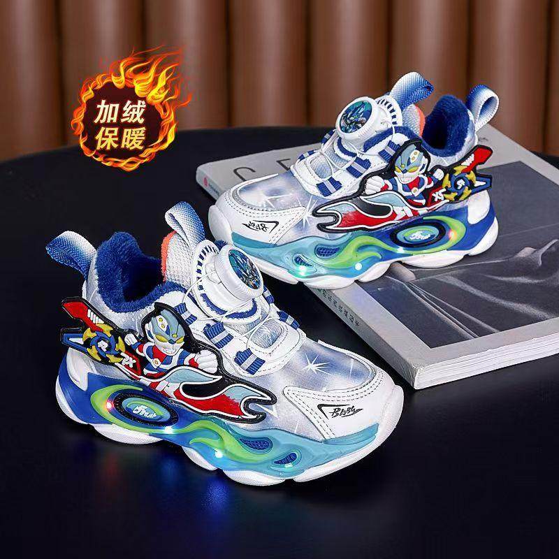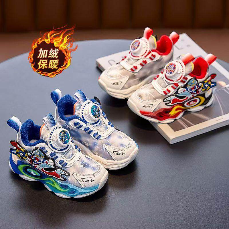 2024秋冬新款儿童奥特曼带灯运动鞋旋转纽扣男童加绒跑步鞋中小童