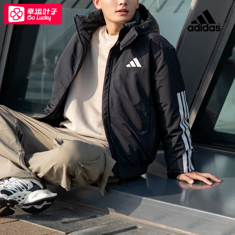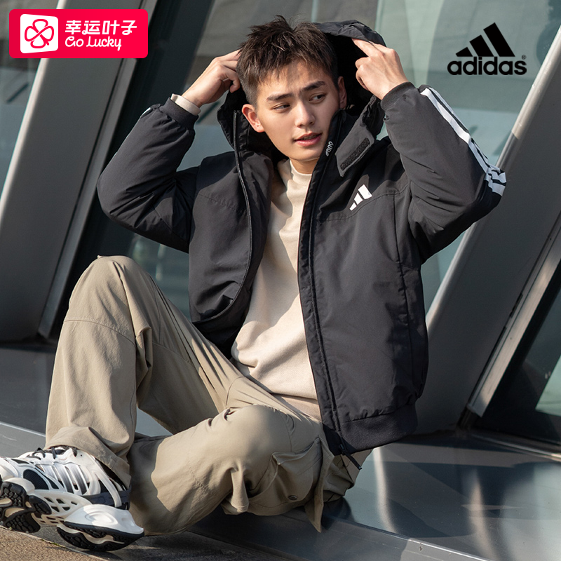 阿迪达斯三条纹羽绒服男款2025冬季新款户外防风运动服连帽外套