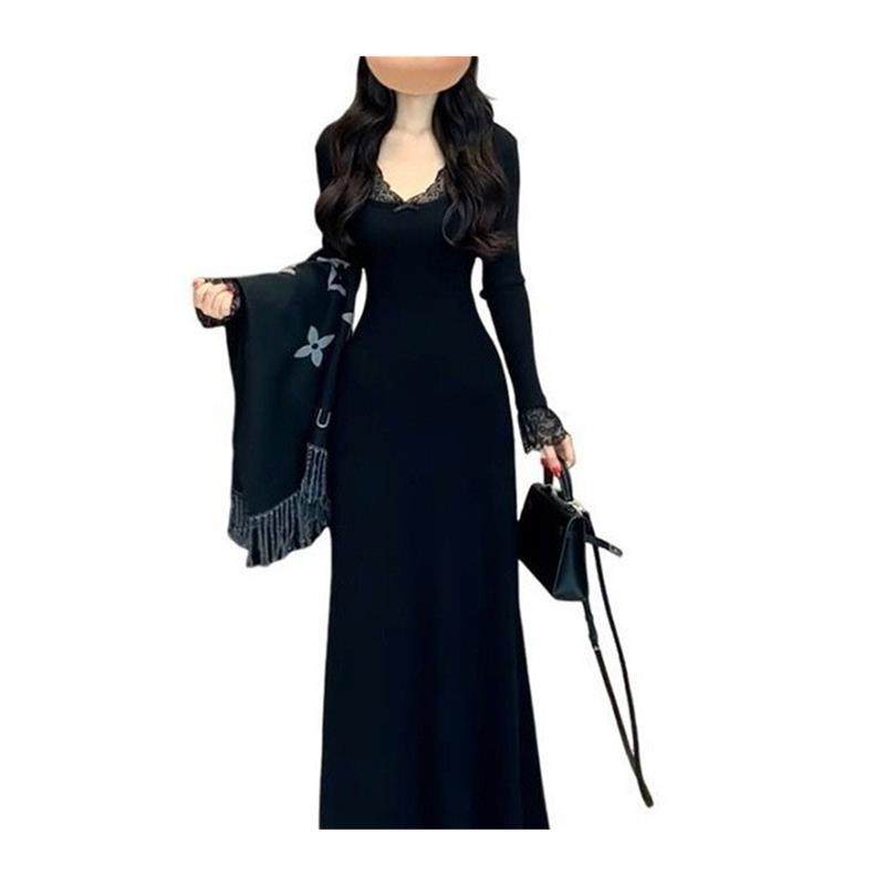 法式赫本风配大衣黑色V领针织连衣裙子女秋冬季2025新款气质绝美