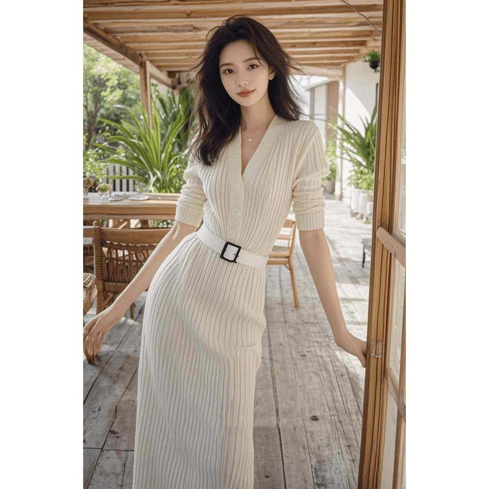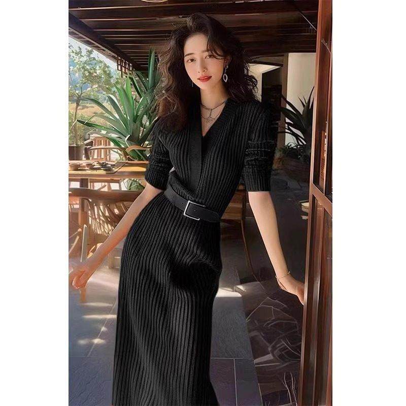 欧洲站红色针织长款裙子2025秋冬新款御姐高级感收腰打底连衣裙女