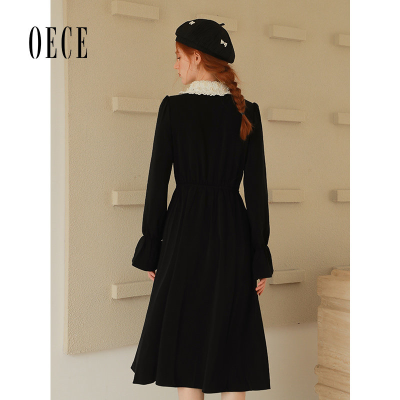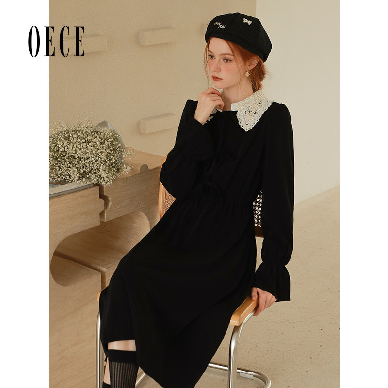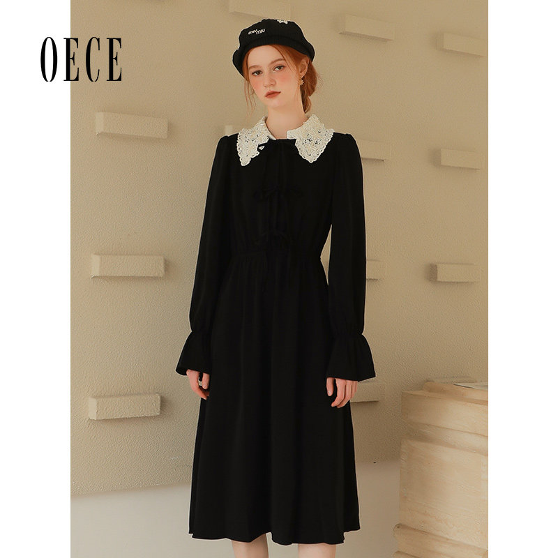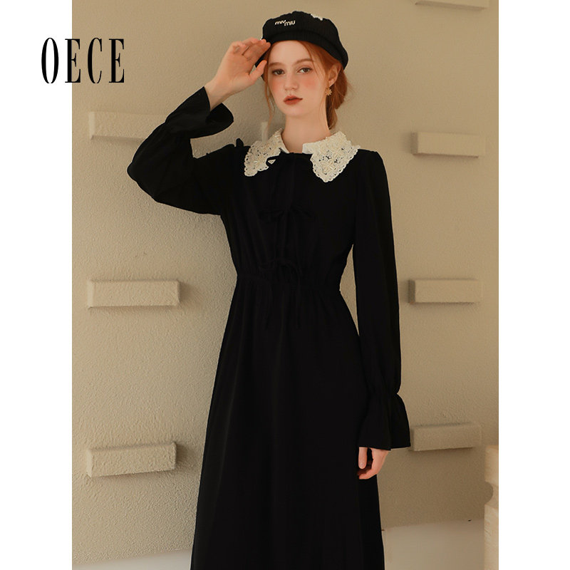 Oece复古小黑裙春秋季新款女装设计感小众娃娃领气质连衣裙子