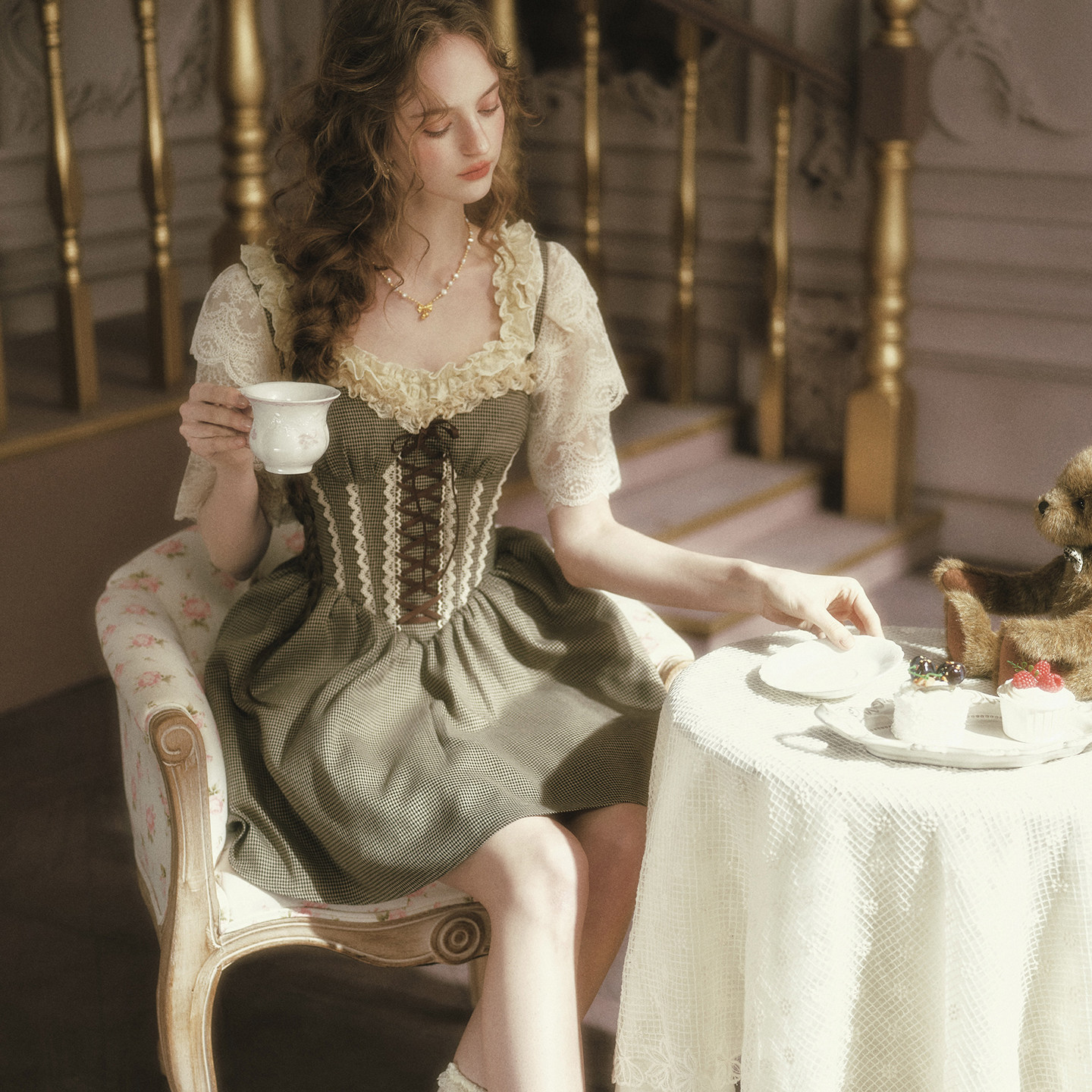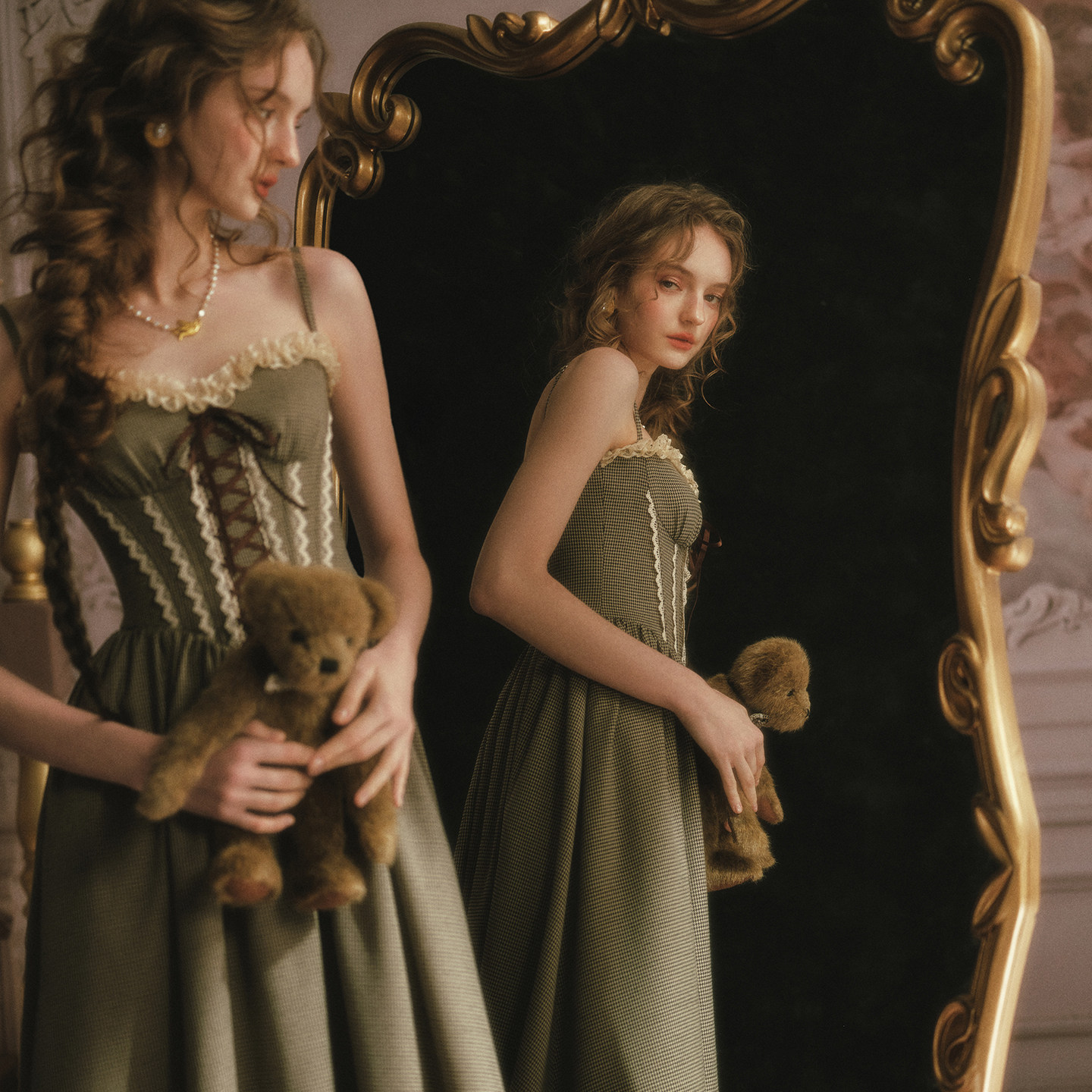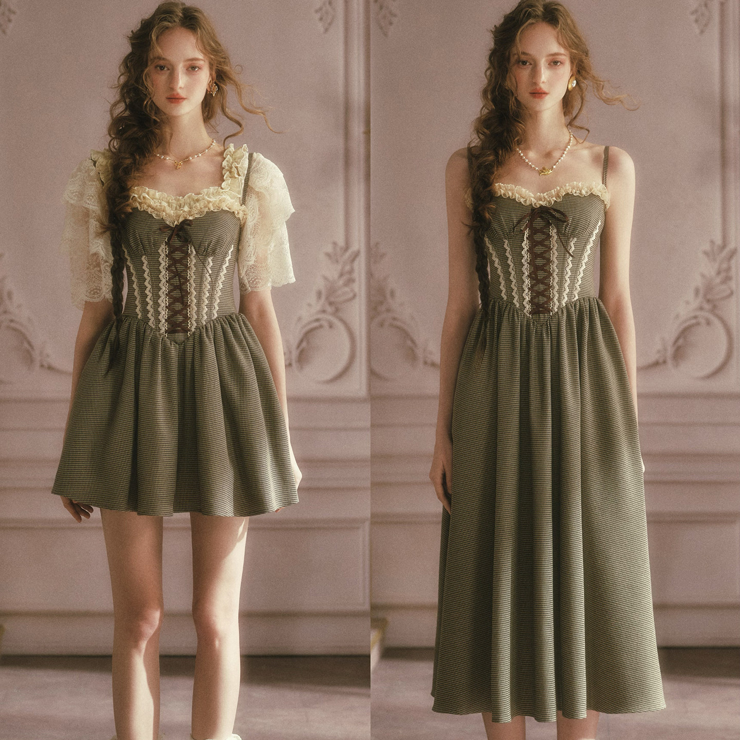 LaceMade 小熊有约 法式田园千鸟格咖色吊带裙长款连衣裙小个子女