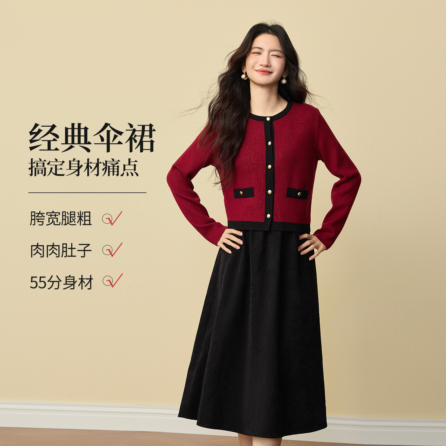 熙世界小香风圣诞红色针织毛衣套装女秋冬赫本风背心连衣裙两件套