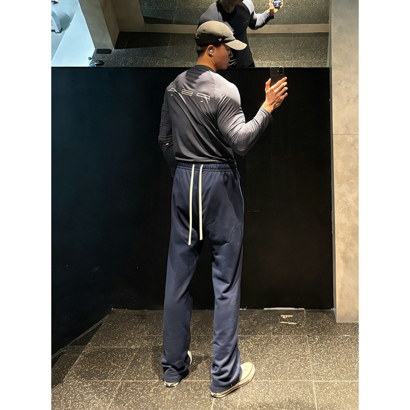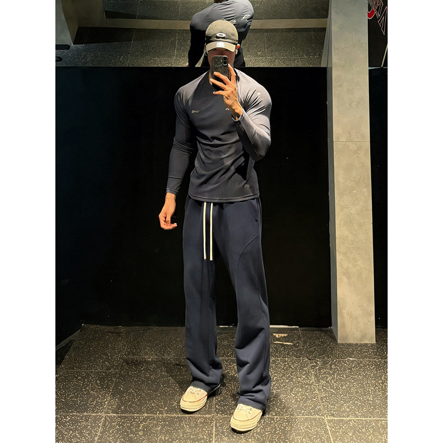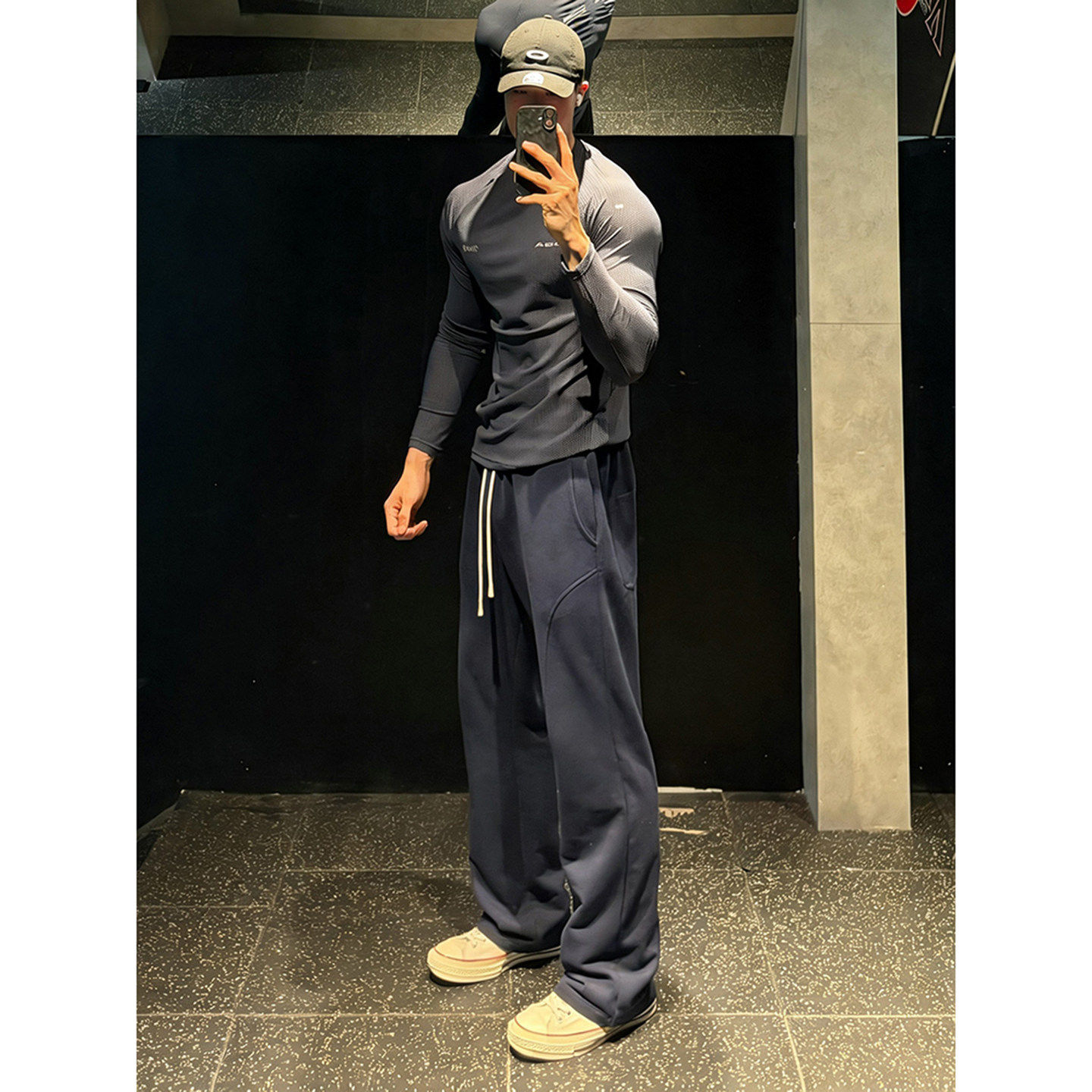 藏青色运动健身卫裤男款冬季加绒美式弯刀裤子斜切宽松直筒休闲裤